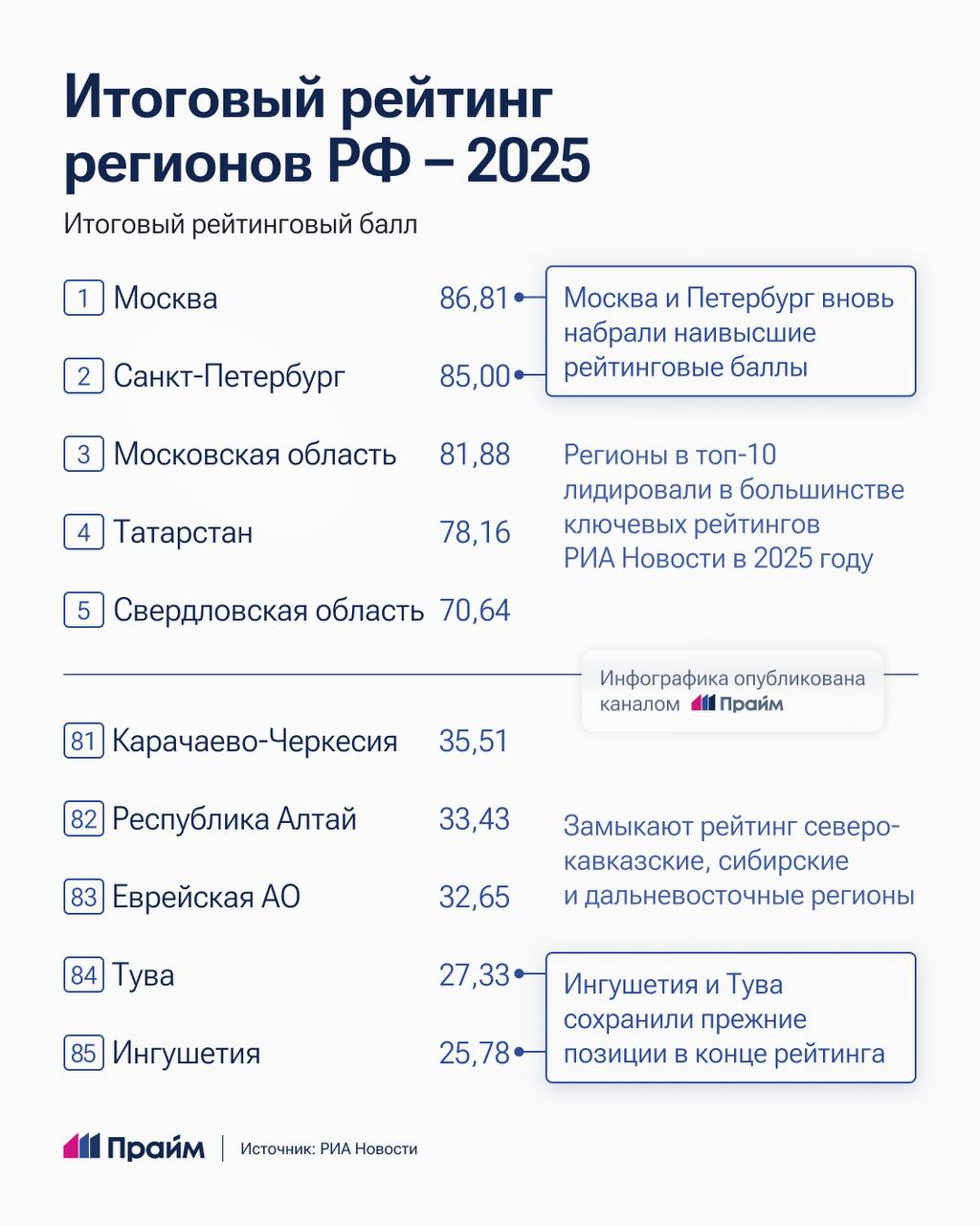 Москва, Петербург и Московская область возглавили итоговый рейтинг российских регионов