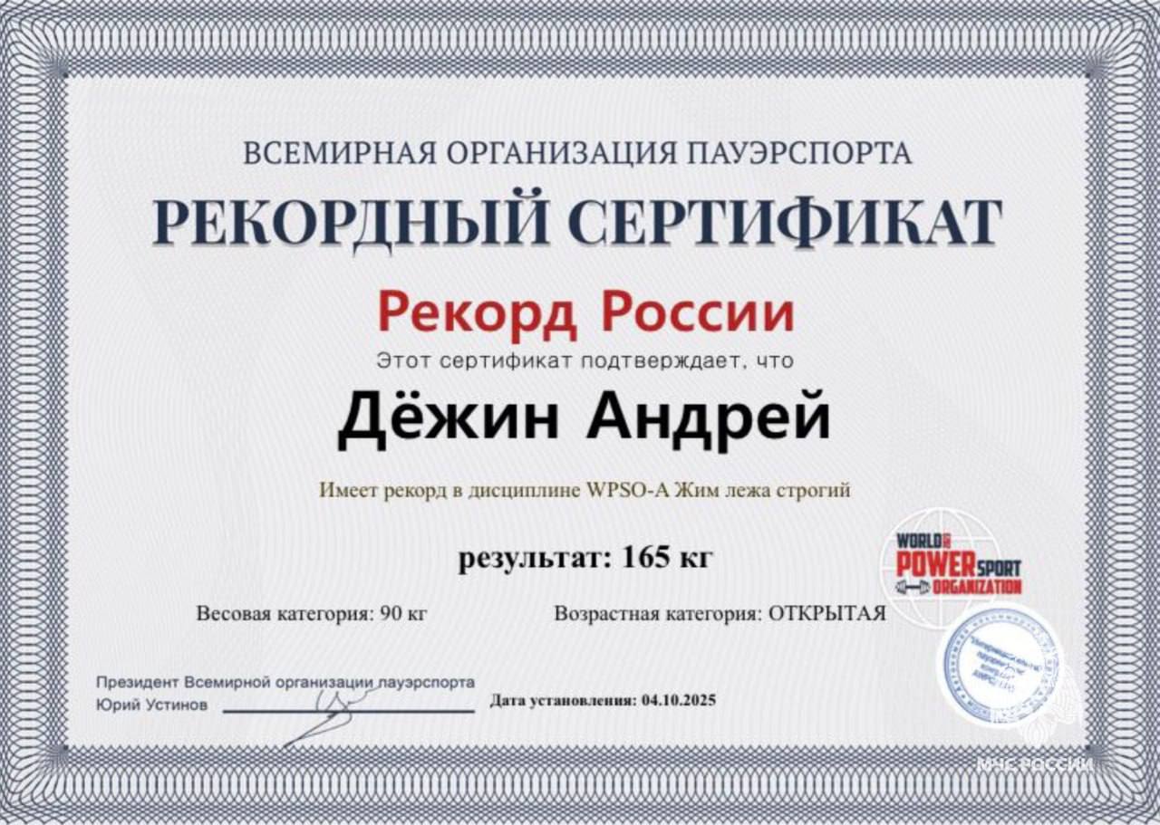На счету Андрея 11 рекордов России и 8 рекордов Московской области в жиме штанги лежа. Он является:
