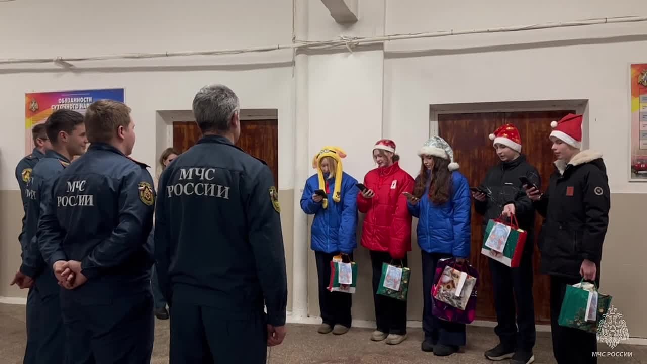 Ребята поздравили пожарных с наступающим Новым годом, 35-летием МЧС России и Днём спасателя Российской Федерации.