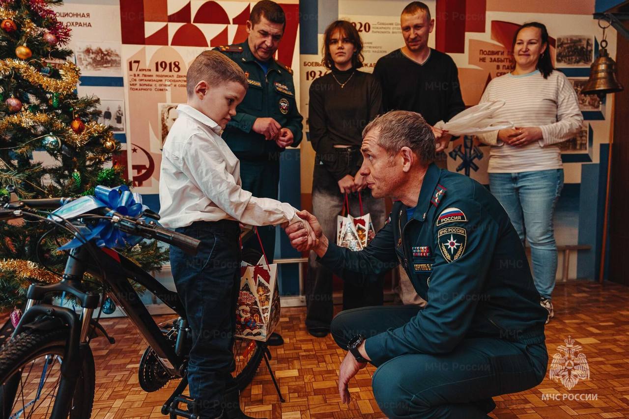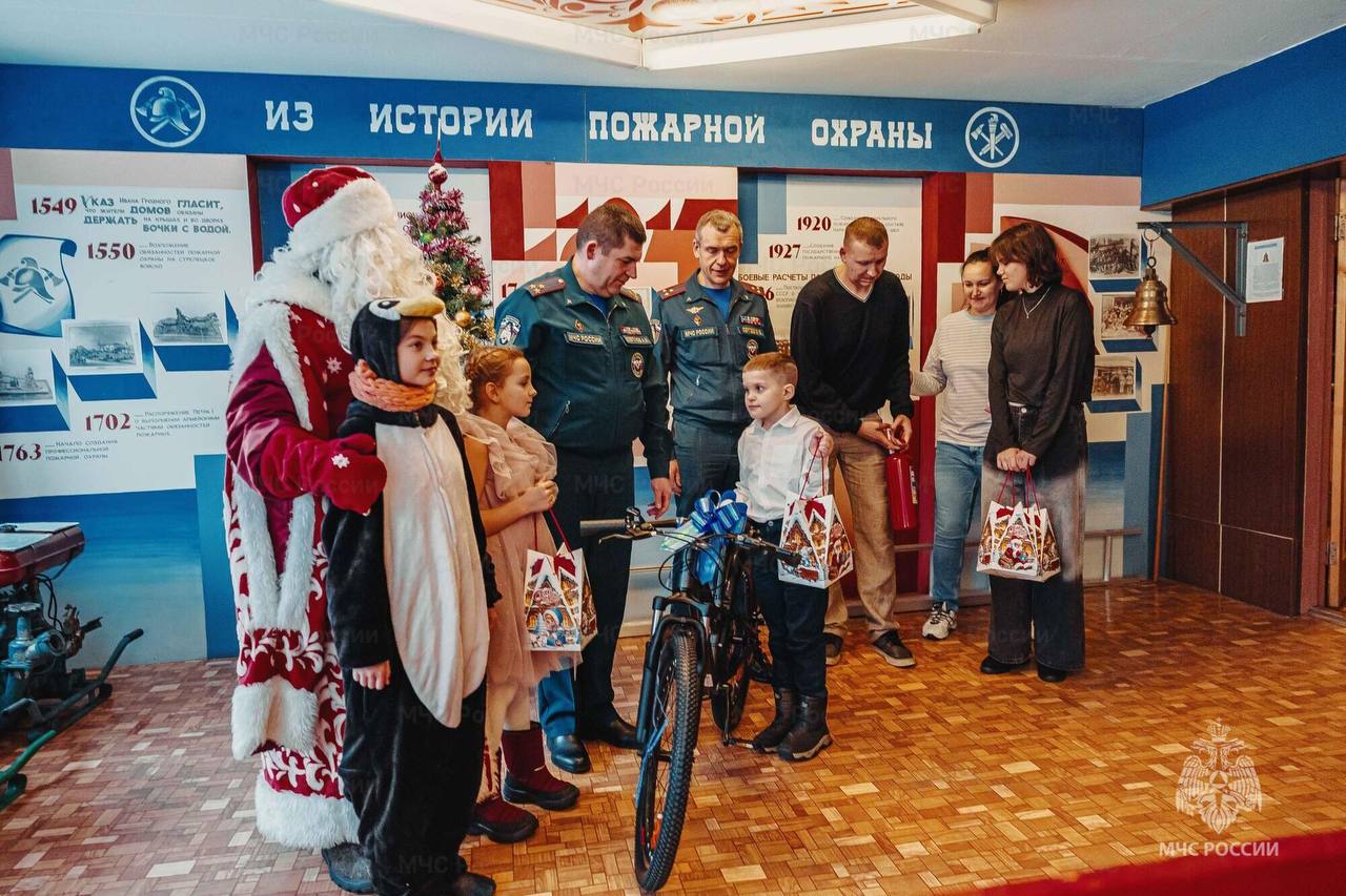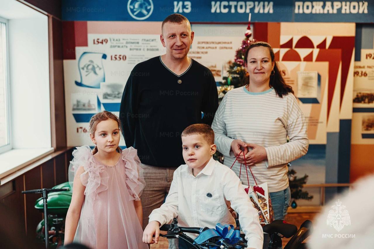 Момент вручения превратился в настоящий семейный праздник с улыбками, поздравлениями и тёплой атмосферой. Помимо самого велосипеда и сладких подарков, семье были вручены полезные и жизненно важные предметы: огнетушители и автономные пожарные извещатели.