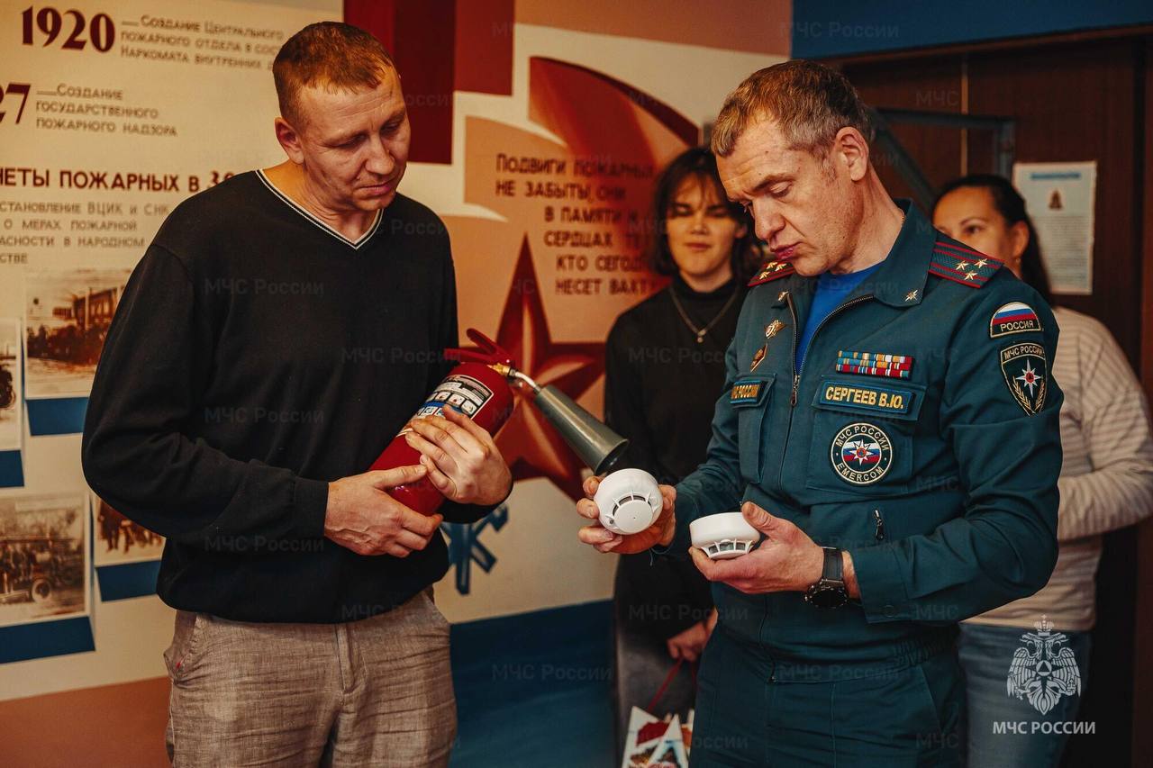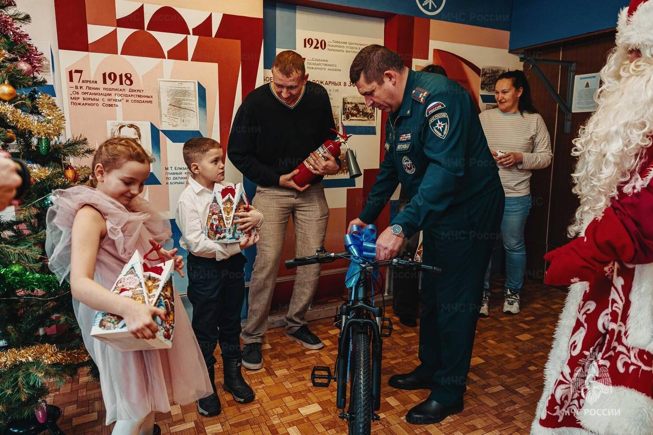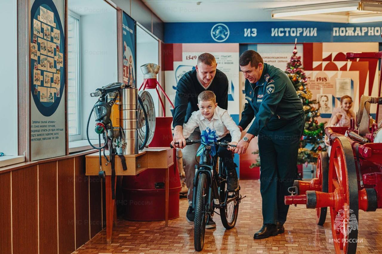 Момент вручения превратился в настоящий семейный праздник с улыбками, поздравлениями и тёплой атмосферой. Помимо самого велосипеда и сладких подарков, семье были вручены полезные и жизненно важные предметы: огнетушители и автономные пожарные извещатели.