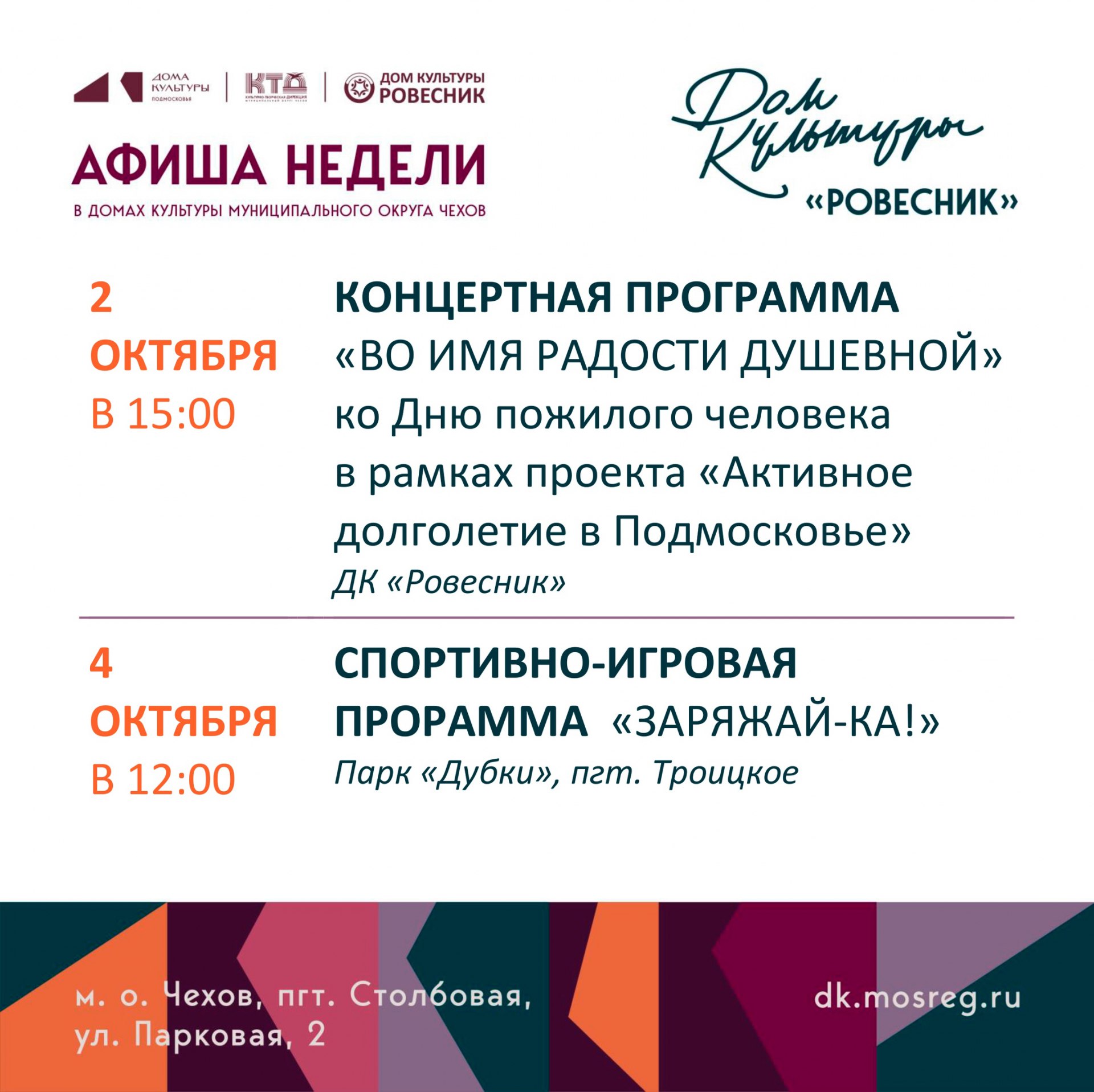 Афиша недели ДК «Ровесник» м.о. Чехов