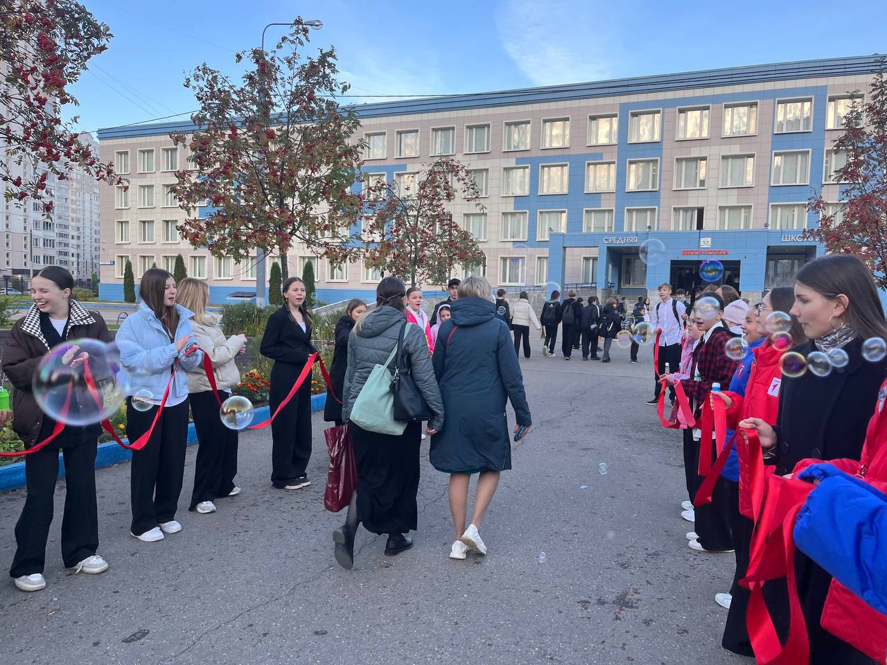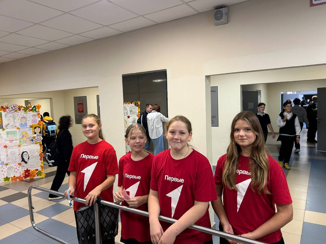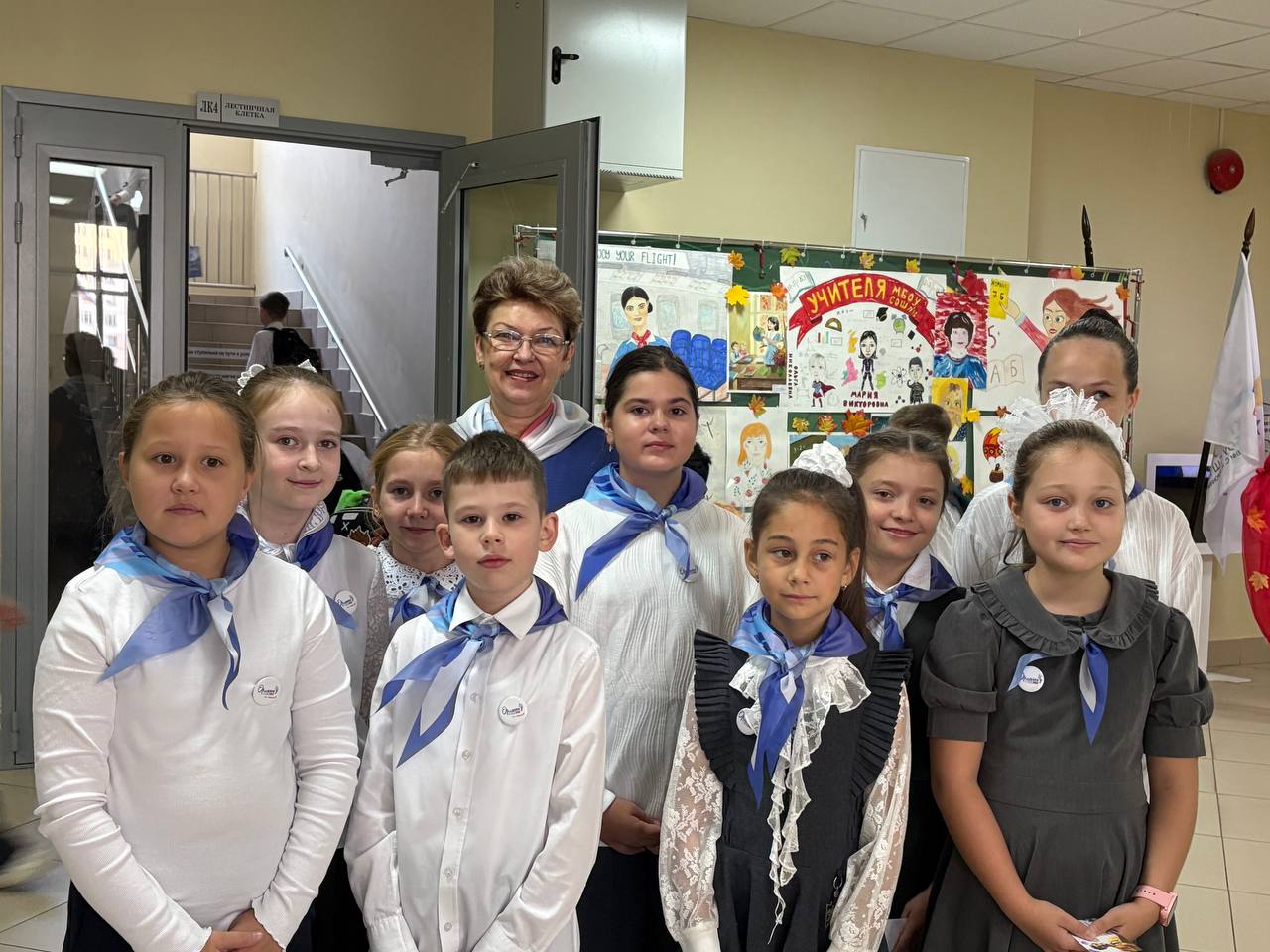 в школе педагогов встречали активисты ДР «Созвездие», «Движение Первых», «Орлята России», ЮИД