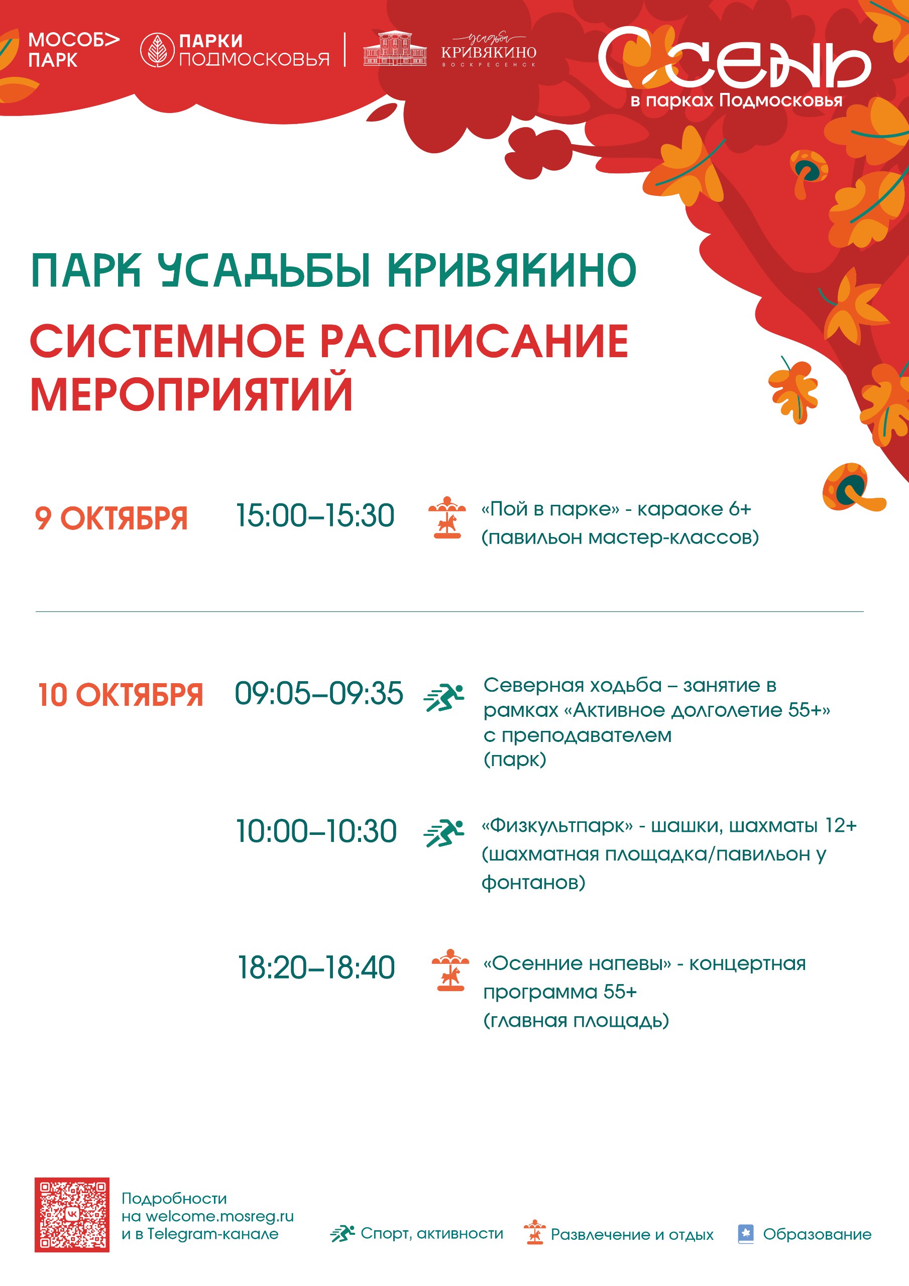 Парки Воскресенска в рамках проекта "Осень в парках Подмосковья" приглашают жителей и гостей округа на разнообразные игровые и спортивные активности, концерты, квесты, мастер-классы, экскурсии и другие осенние мероприятия на любой вкус.