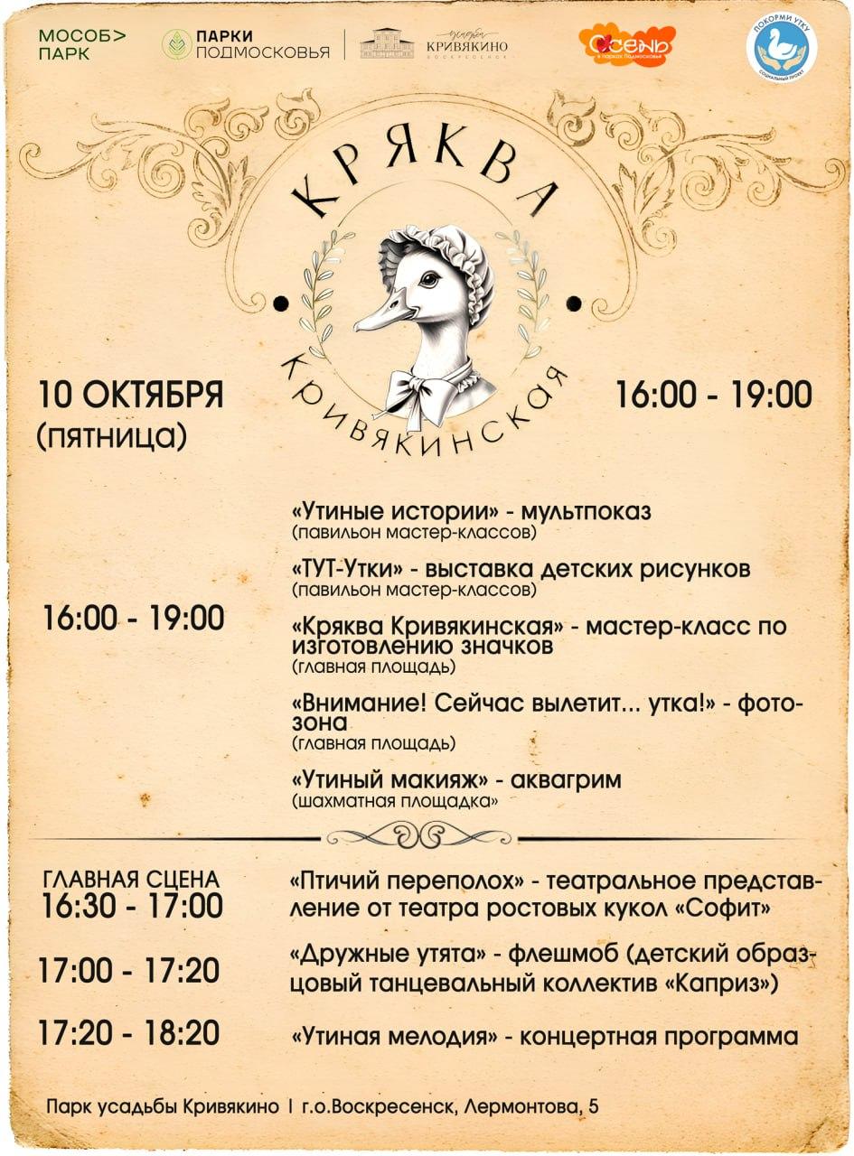 10 октября в парке усадьбы Кривякино, г.о. Воскресенск, пройдет ежегодный фестиваль «Кряква Кривякинская». Как рассказали в Министерстве культуры и туризма Московской области, регламент фестиваля предполагает семейный отдых в парке.