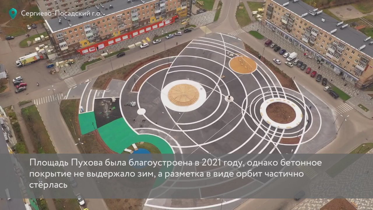 Площадь Пухова была благоустроена в 2021 году, однако бетонное покрытие не выдержало зим, а разметка в виде орбит частично стёрлась. Сами жители также озвучивали недочёты благоустройства: холм с горкой должен иметь резиновое покрытие, лавочки должны быть со спинками, а территорию площади необходимо озеленить.
