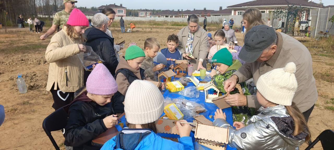 После церемонии открытия для юных жителей комплекса провели мастер-класс по изготовлению скворечников, которые затем разместили на деревьях.