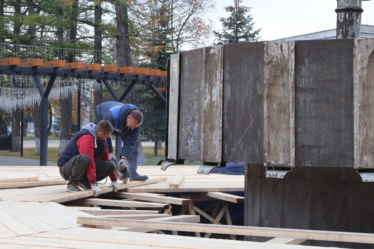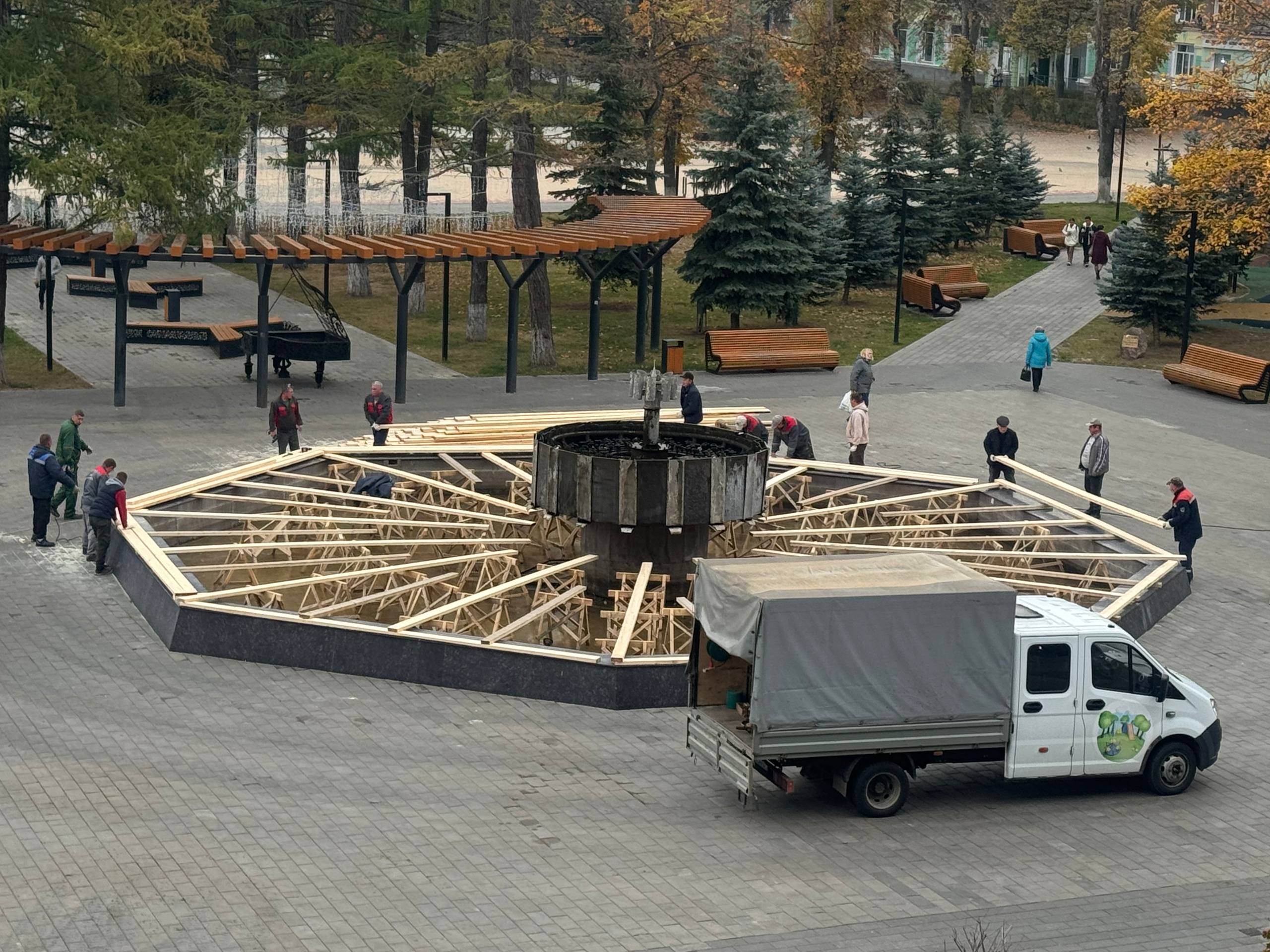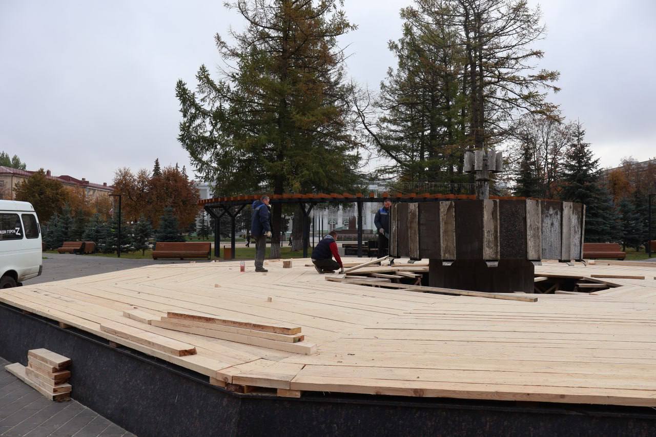 На чаше фонтана в центральном сквере города смонтирован деревянный настил, который будет "защищать" фонтан до следующего сезона. Как и в прошлом году, эту площадку планируют использовать для размещения световых новогодних инсталляций, которые появятся здесь ближе к новогодним праздникам.