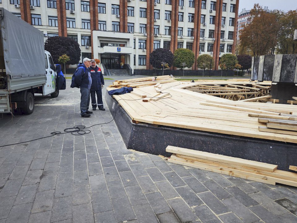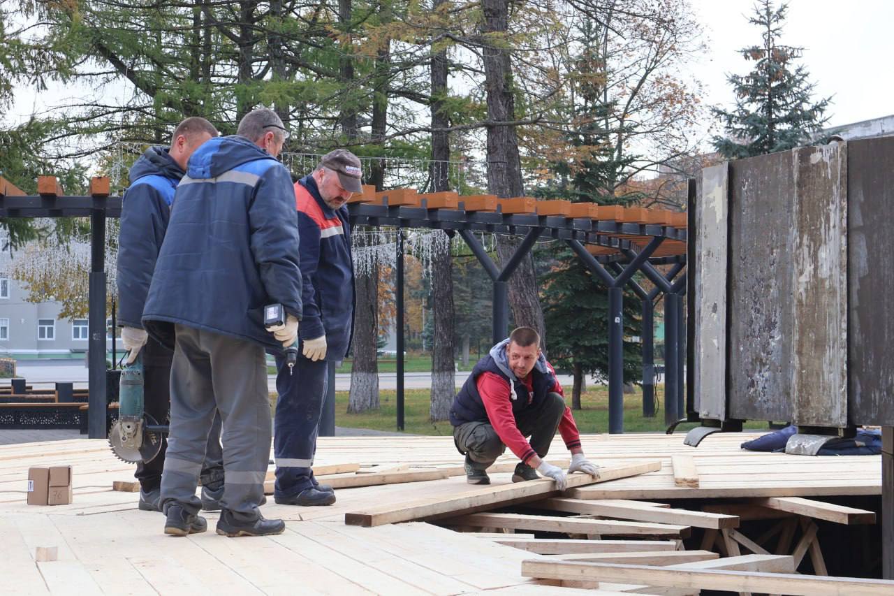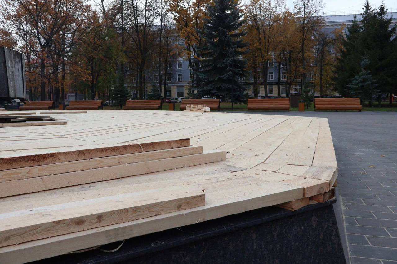 На чаше фонтана в центральном сквере города смонтирован деревянный настил, который будет "защищать" фонтан до следующего сезона. Как и в прошлом году, эту площадку планируют использовать для размещения световых новогодних инсталляций, которые появятся здесь ближе к новогодним праздникам.