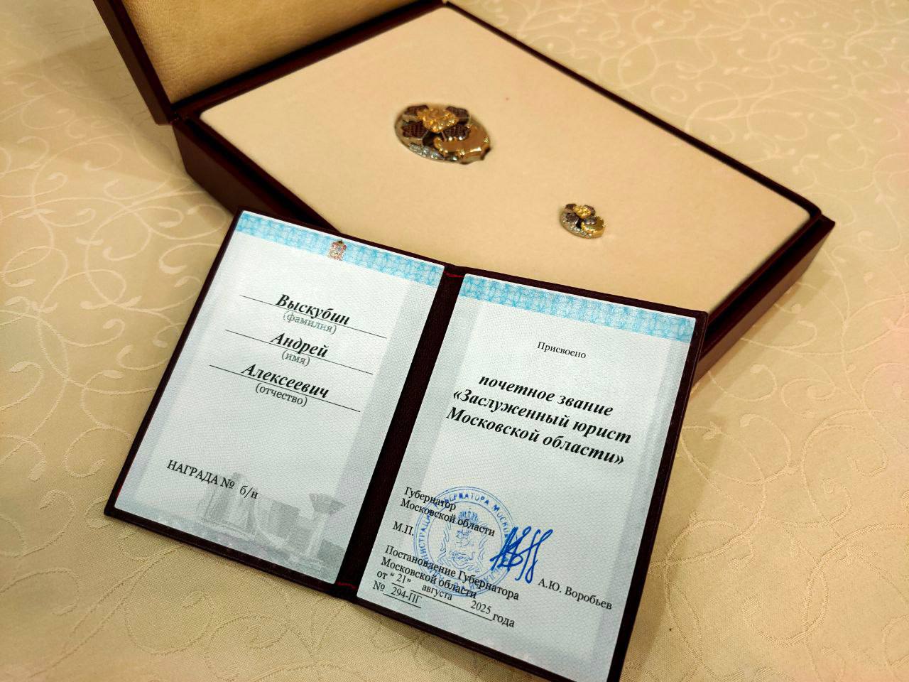 По поручению Губернатора Андрея Воробьёва начальник юридического отдела ФГУП «ВНИИФТРИ»Андрей Алексеевич Выскубин был удостоен почётного знака «Заслуженный юрист Московской области».
