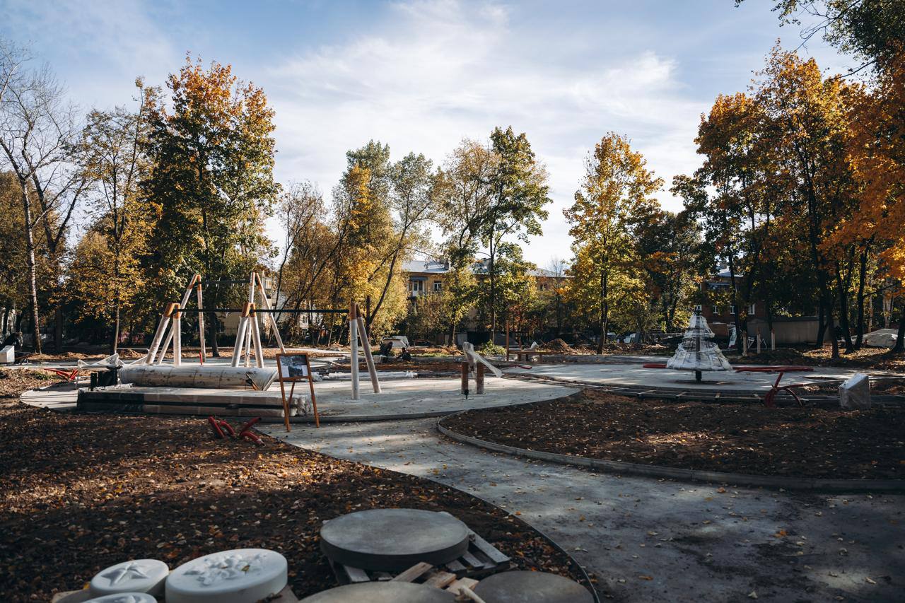 завершён основной демонтаж и подготовлено основание под спортивные площадки и воркаут зоны. Уложено безопасное резиновое покрытие, установлены тренажёры, турники и элементы для занятий на свежем воздухе;