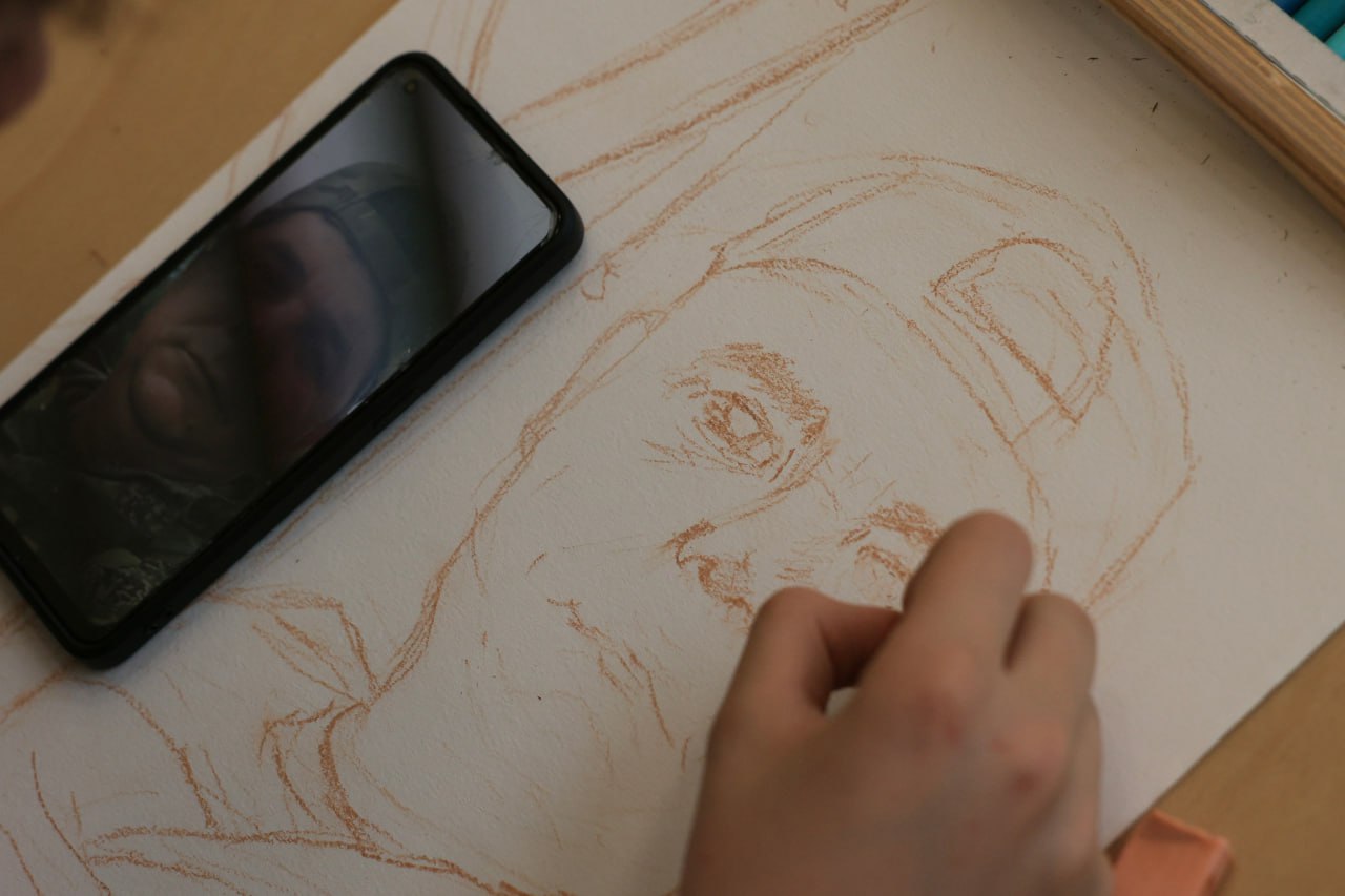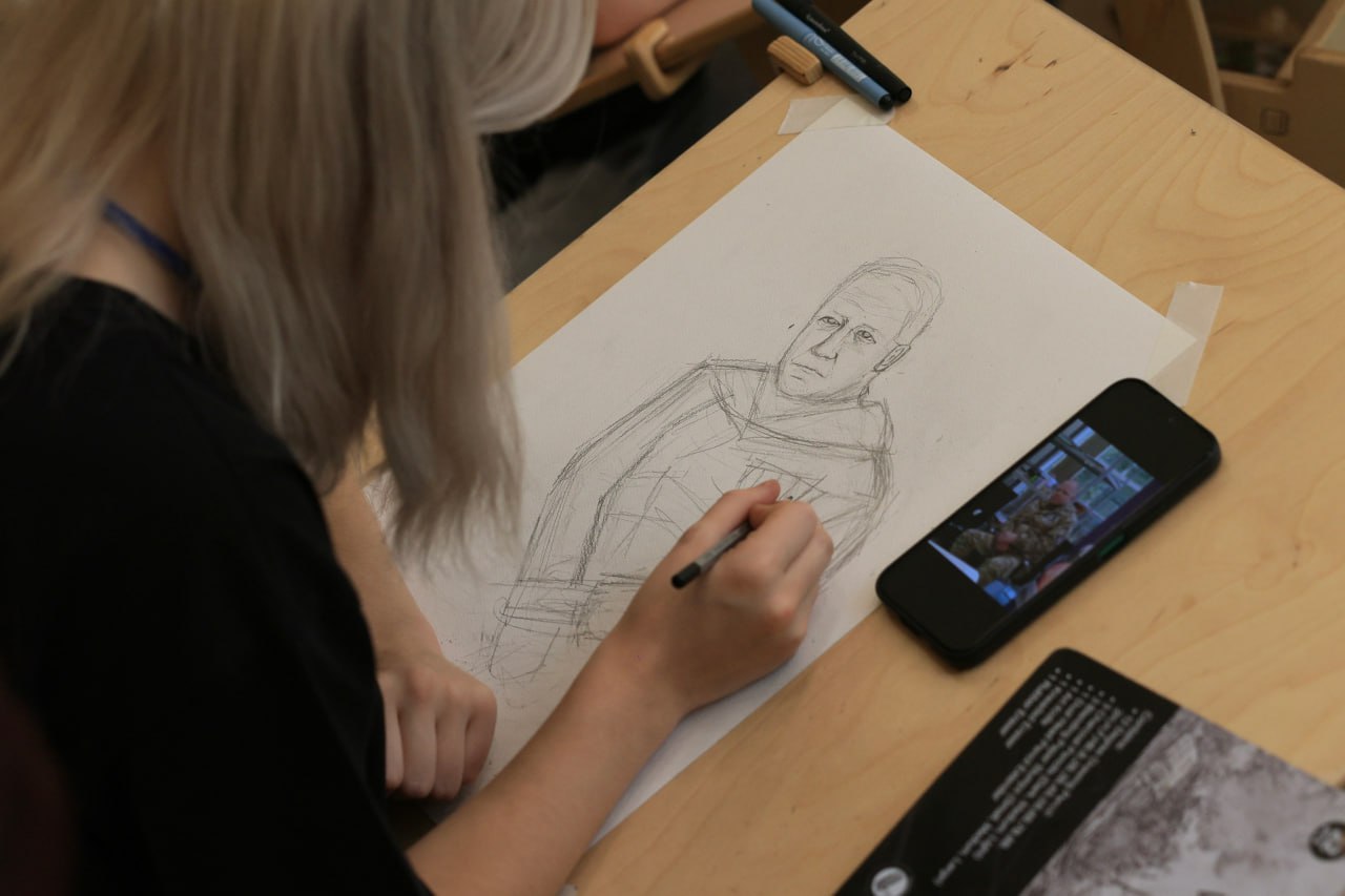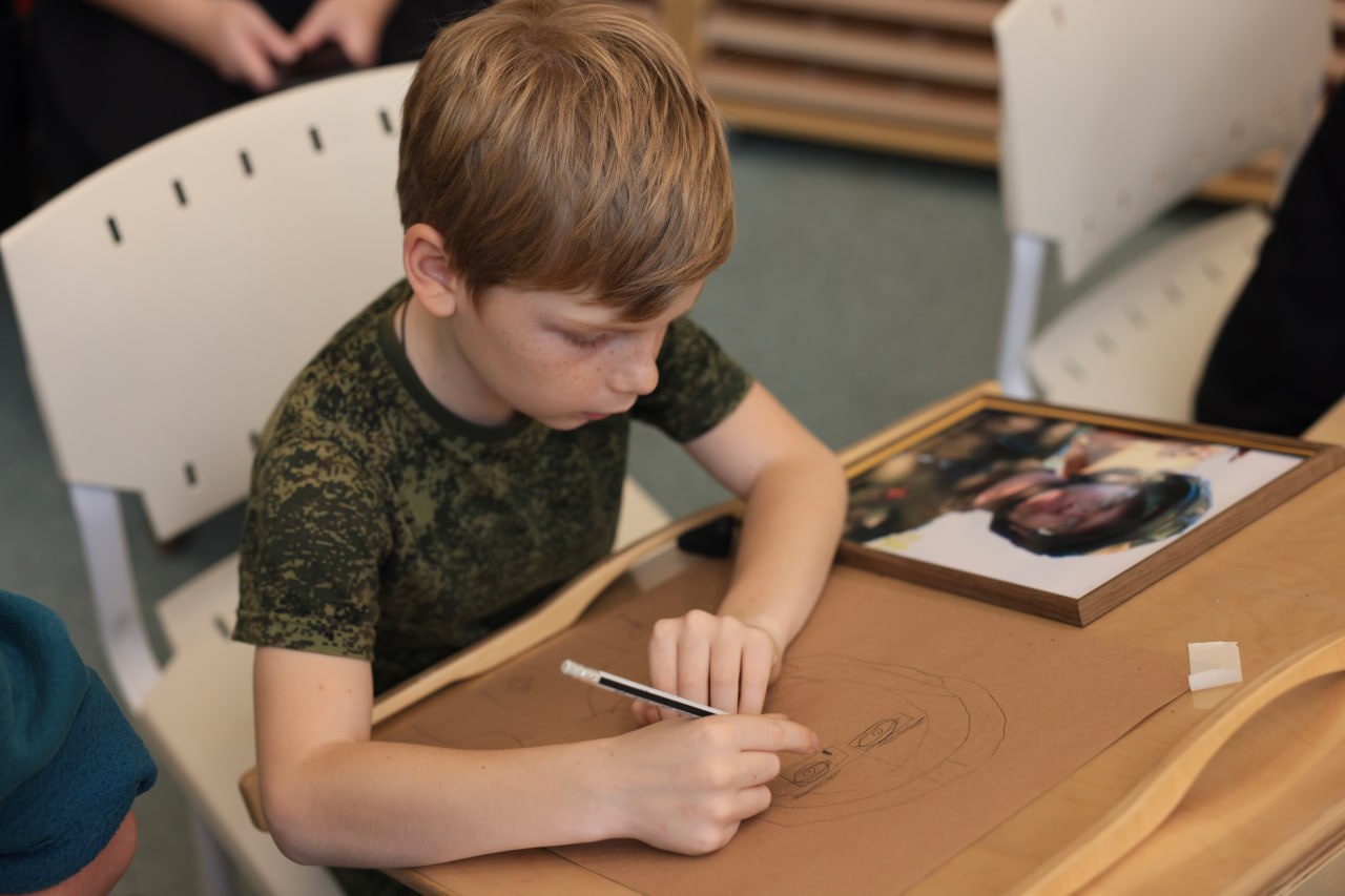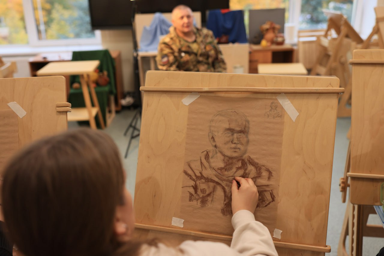 По фотографиям школьники рисовали отцов – военнослужащих, которые сейчас выполняют свой долг в зоне СВО, дедов и прадедов, воевавших в Великую Отечественную. Ребята поопытнее создавали портреты с натуры – в этом им с удовольствием помогли королёвские ветераны спецоперации, которые также приняли участие в мастер-классе.