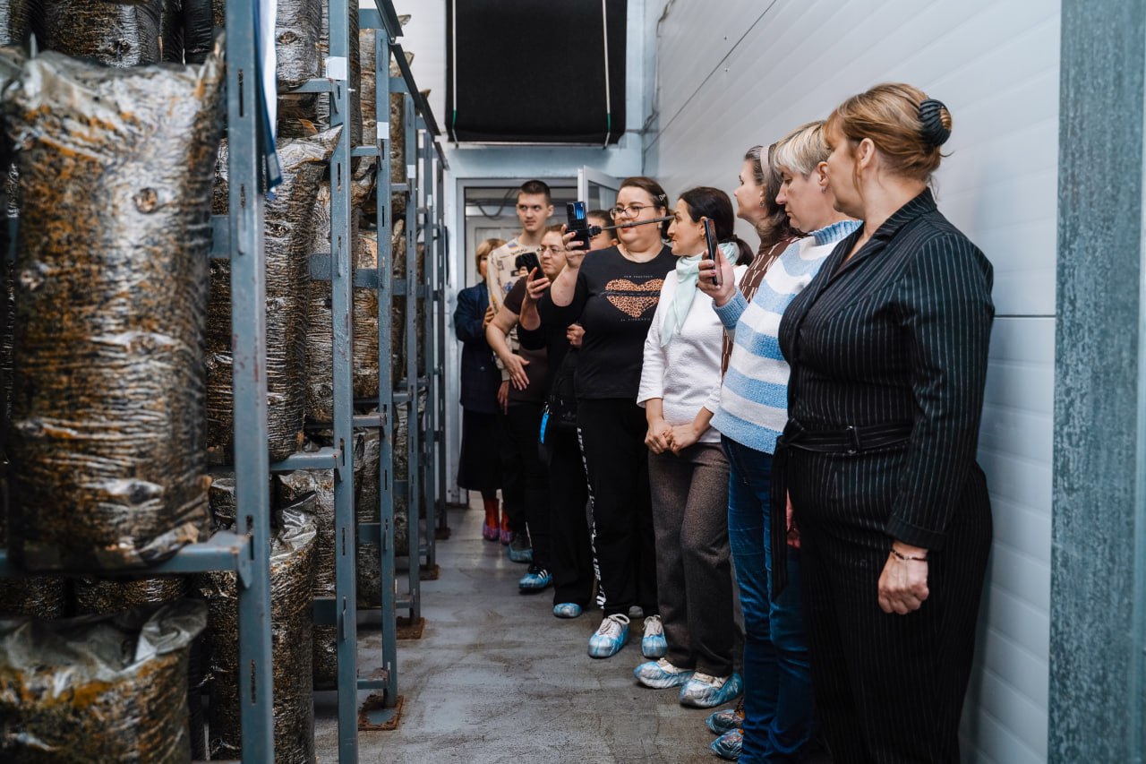 Экскурсию провела Елена Садова. Мамы особенных ребят увидели, как созревает урожай грибов – от зерен до аккуратных гроздьев, которые потом отправляются на полки магазинов.