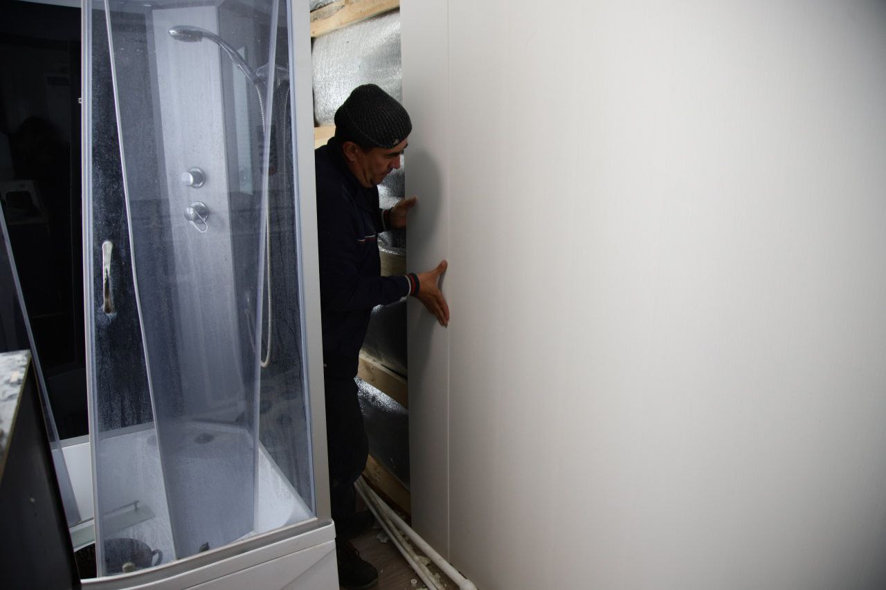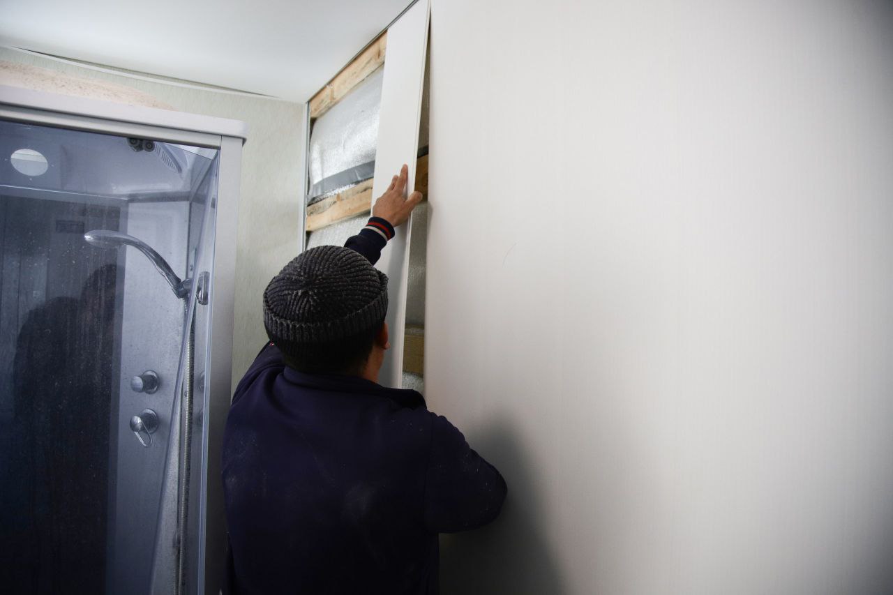 Помогаем и с внутридомовыми работами - строители начали облицовку стен санузла новыми влагостойкими декоративными панелями.