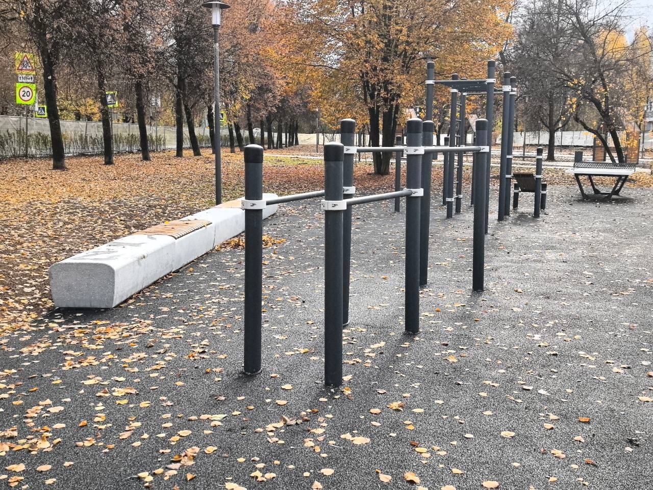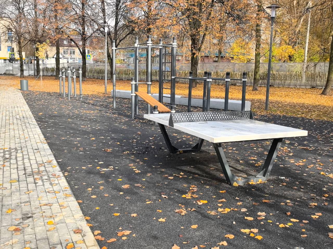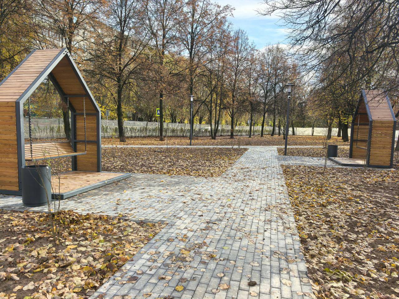 В сквере появились пешеходные дорожки из плитки, уличное освещение, спортивная зона с воркаут-площадкой и теннисным столом. Также организовано пространство для отдыха с качелями и навесом, установлены новые малые архитектурные формы.