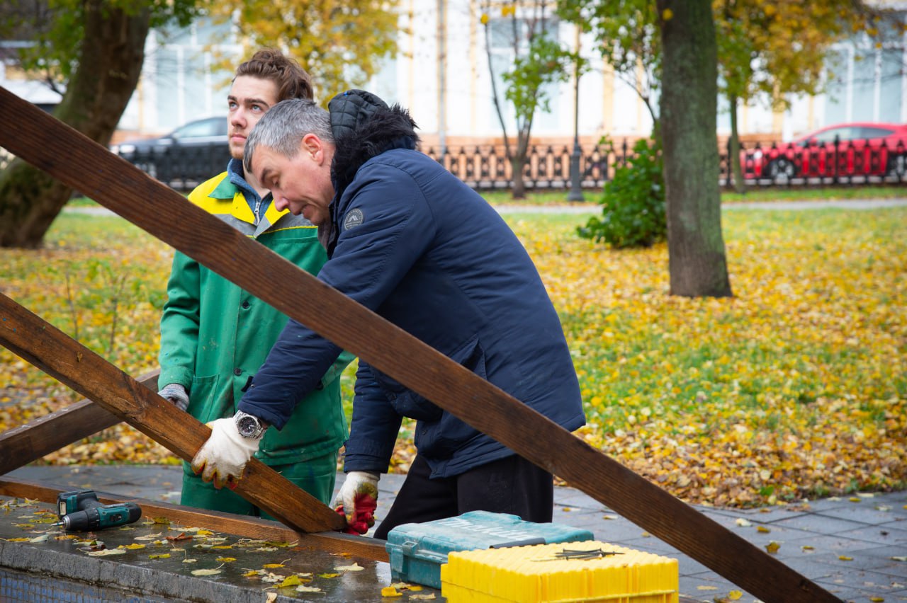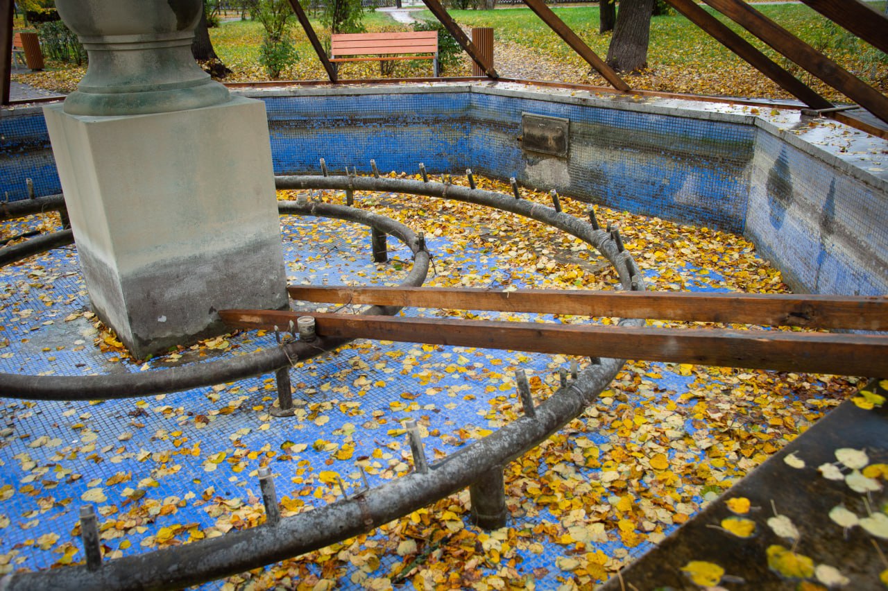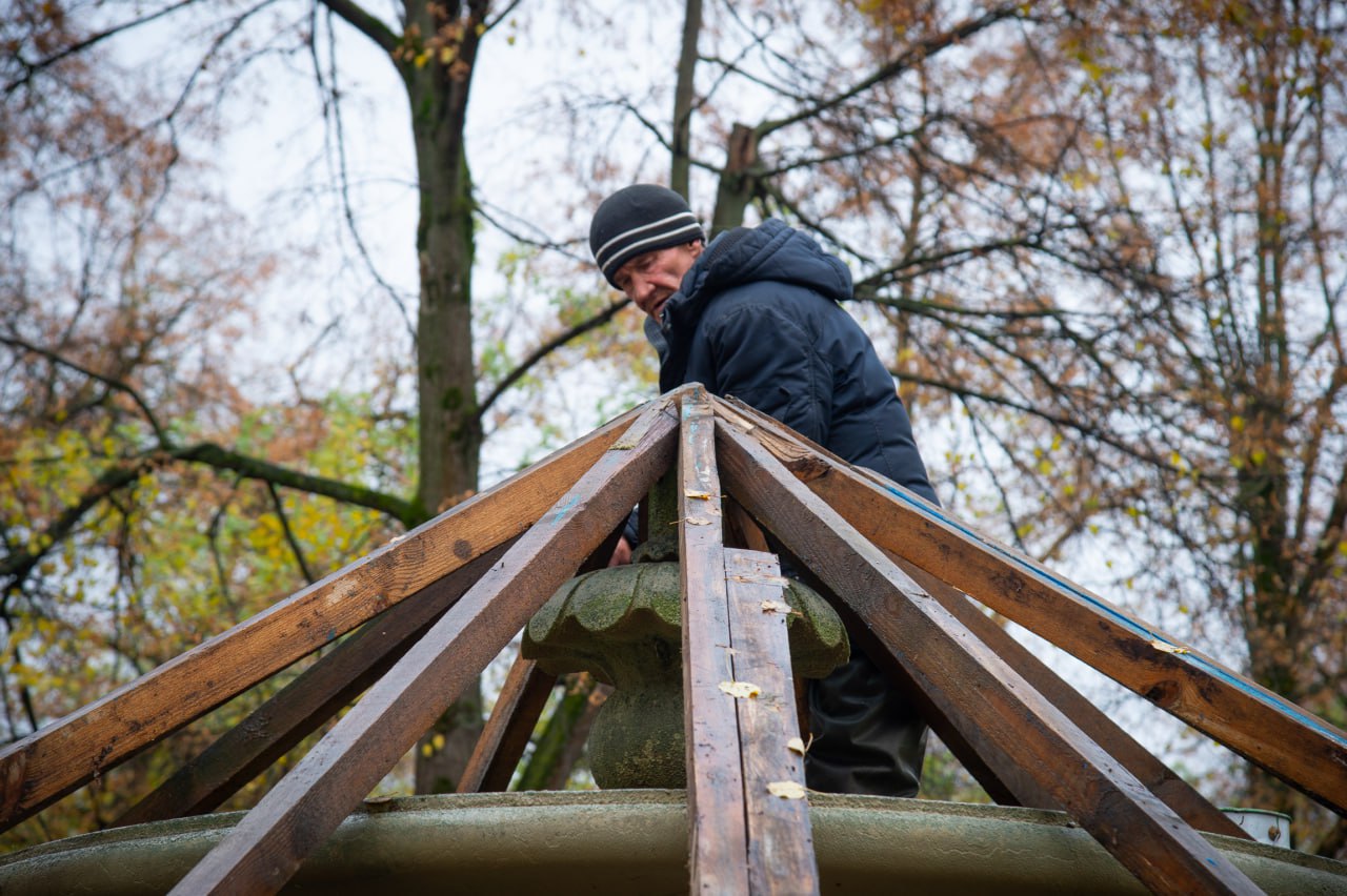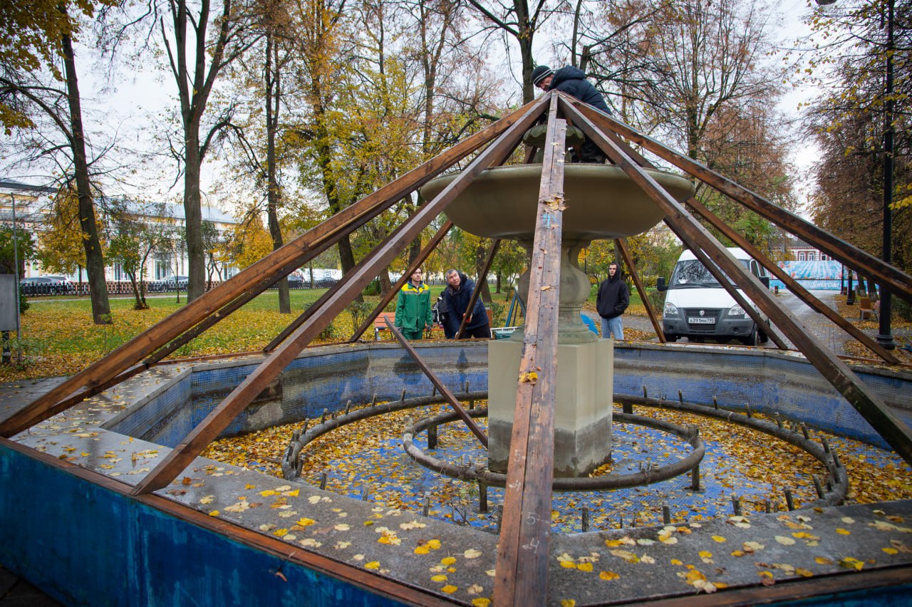После завершения этапа подготовительных работ специалисты накрыли чашу фонтана деревянной конструкцией, чтобы защитить оборудование от повреждения зимой.