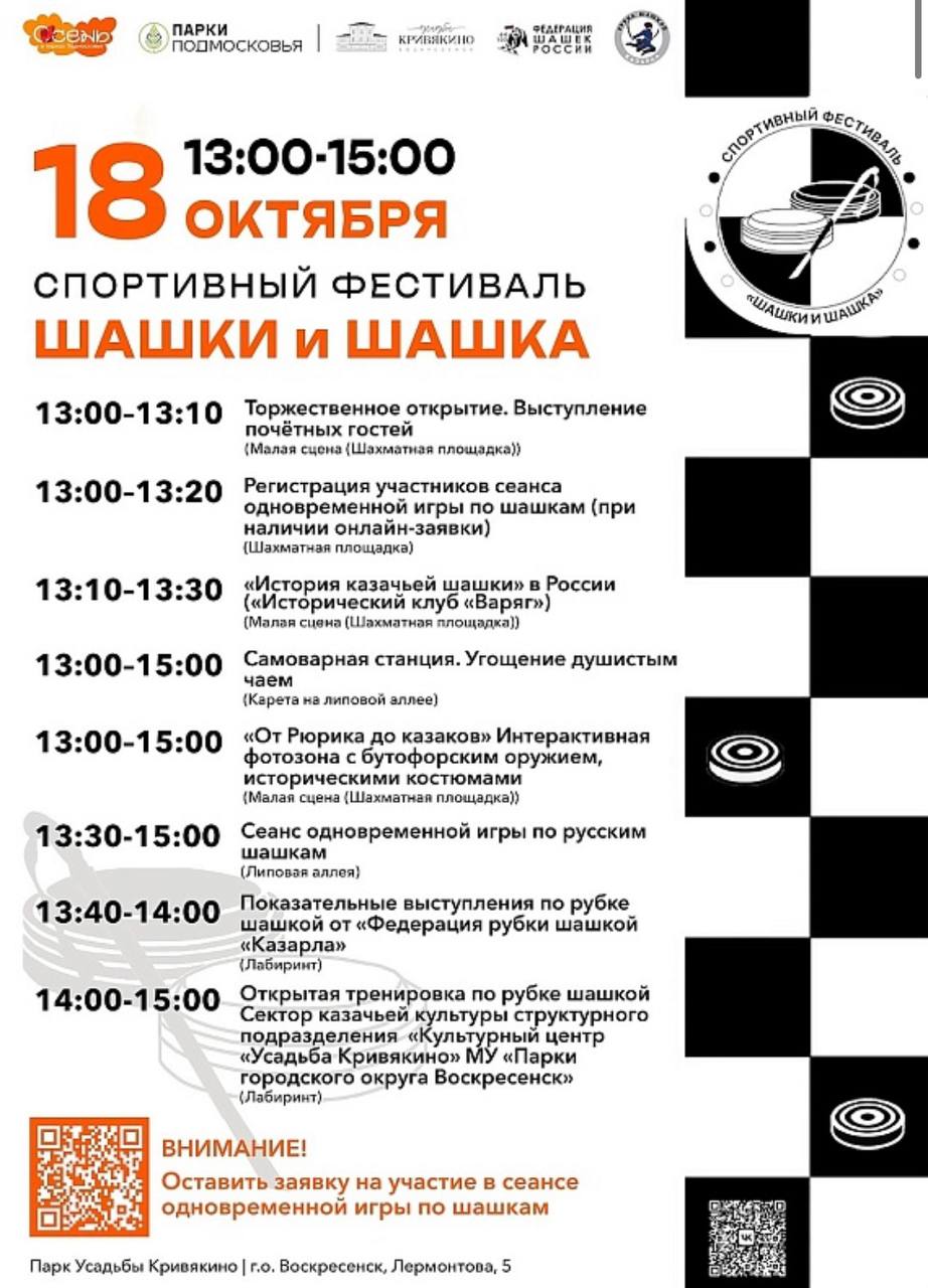 Продолжит мероприятие, с 13:00 до 15:00, спортивный фестиваль «Шашки и Шашка», который посвящен 80-летию Великой Победы и Году Защитника Отечества.