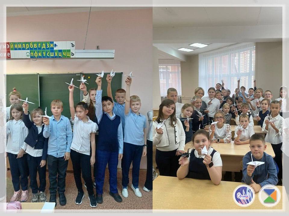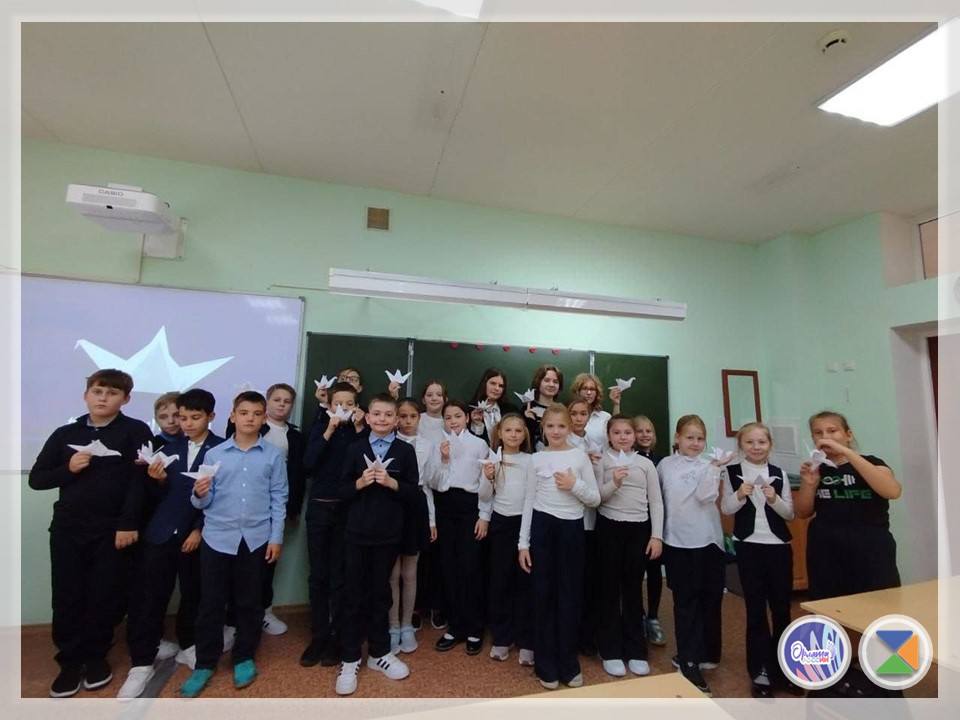 Ребята из разных классов под руководством своих наставников сделали бумажных журавликов.
