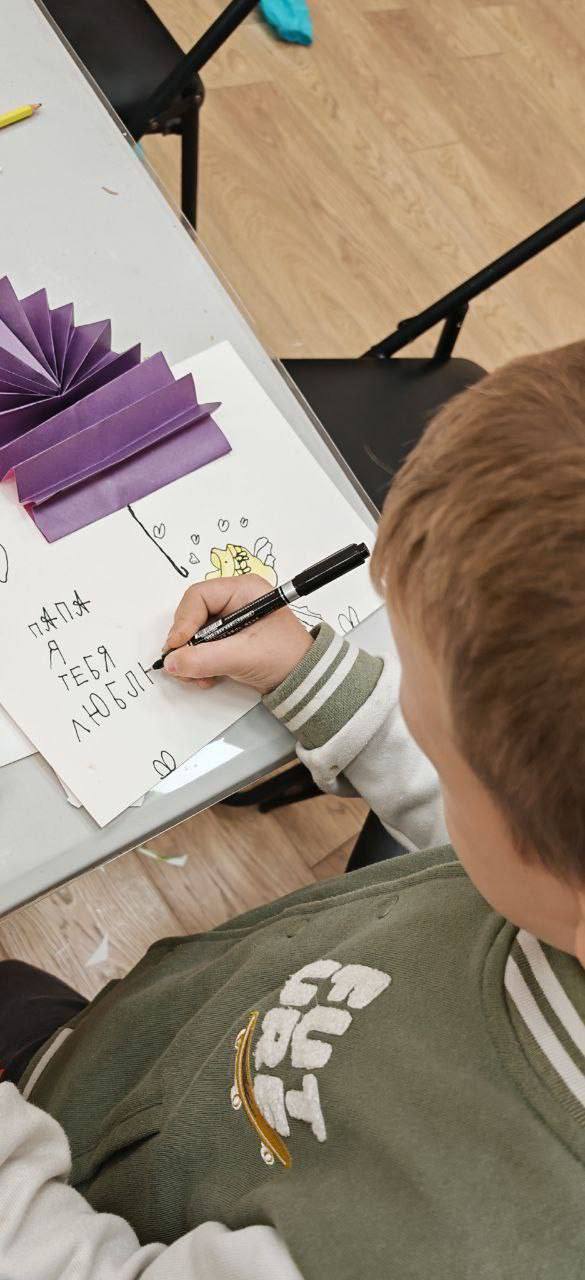 Для детей был организован мастер-класс по созданию открыток. Все поделки дети направят своим папам в зону СВО.