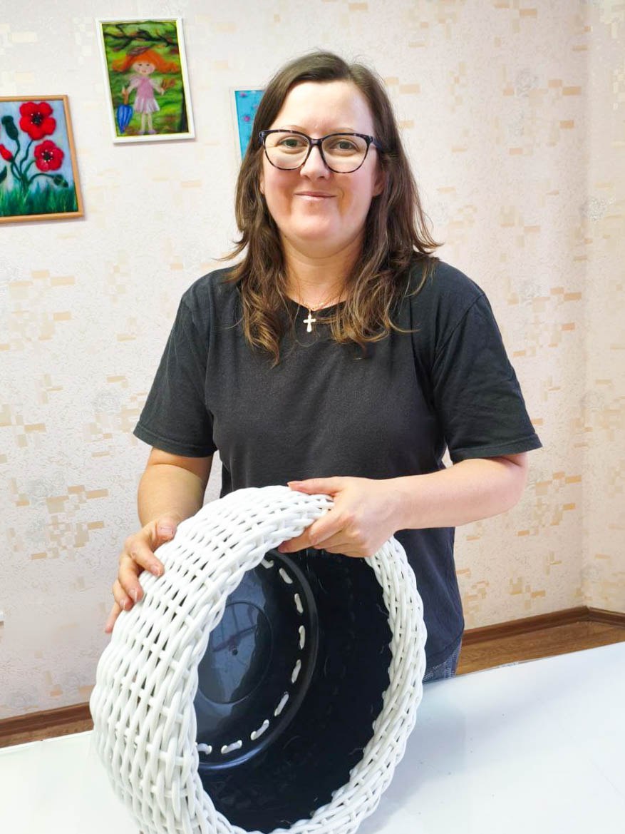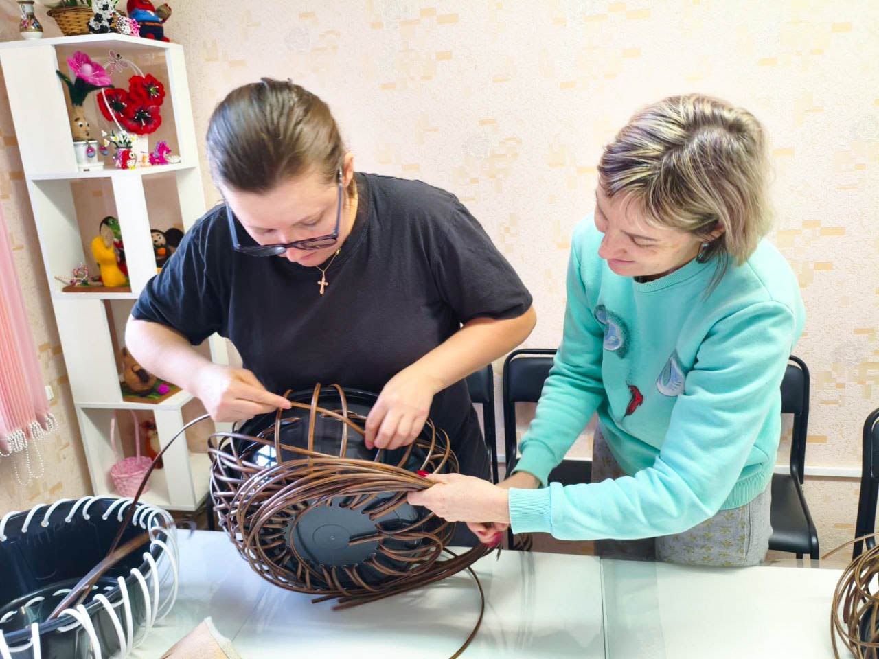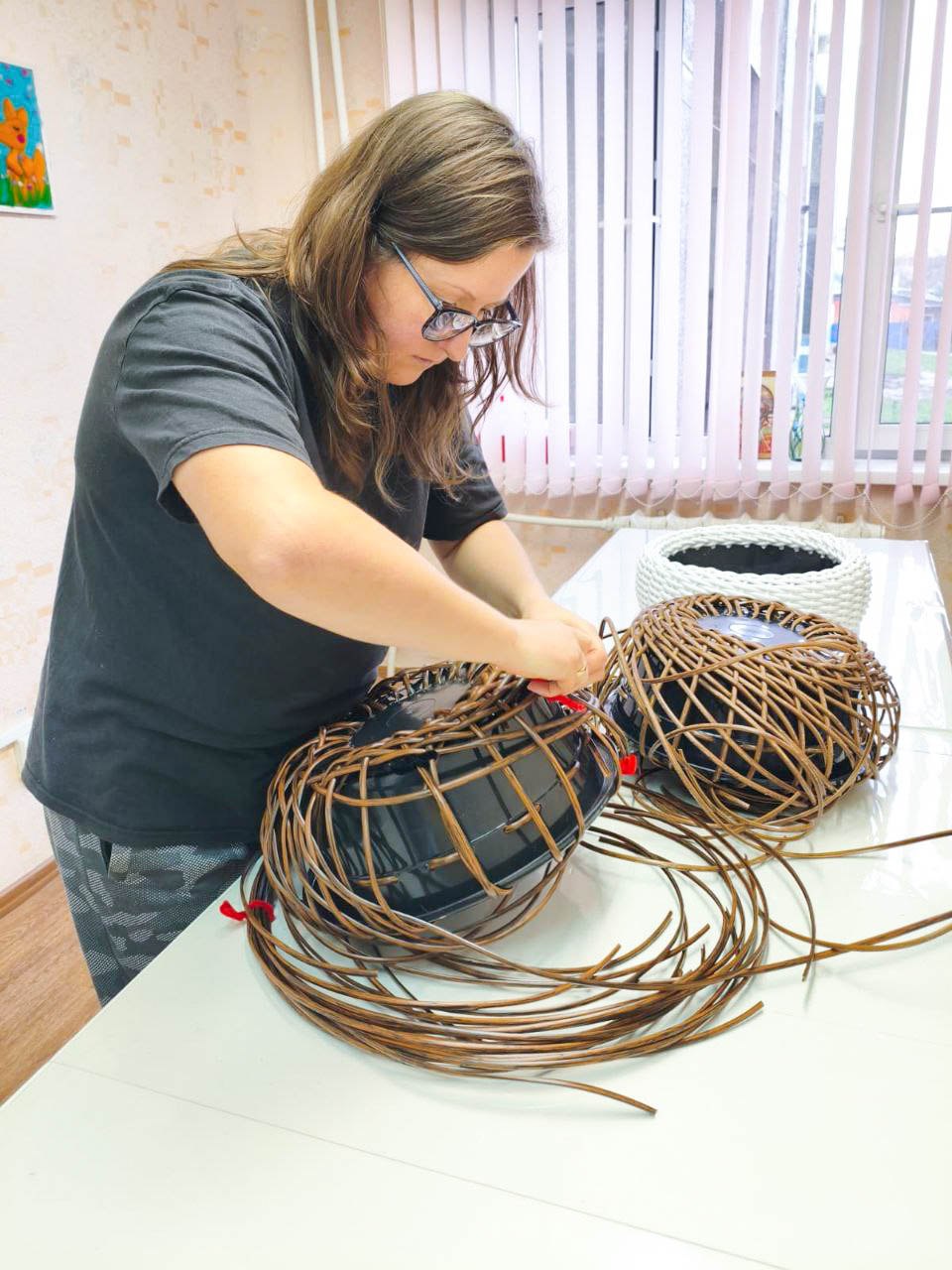 В городе Куровское на творческой встрече мамы особенных ребят начали осваивать технику плетения кашпо из ротанга.
