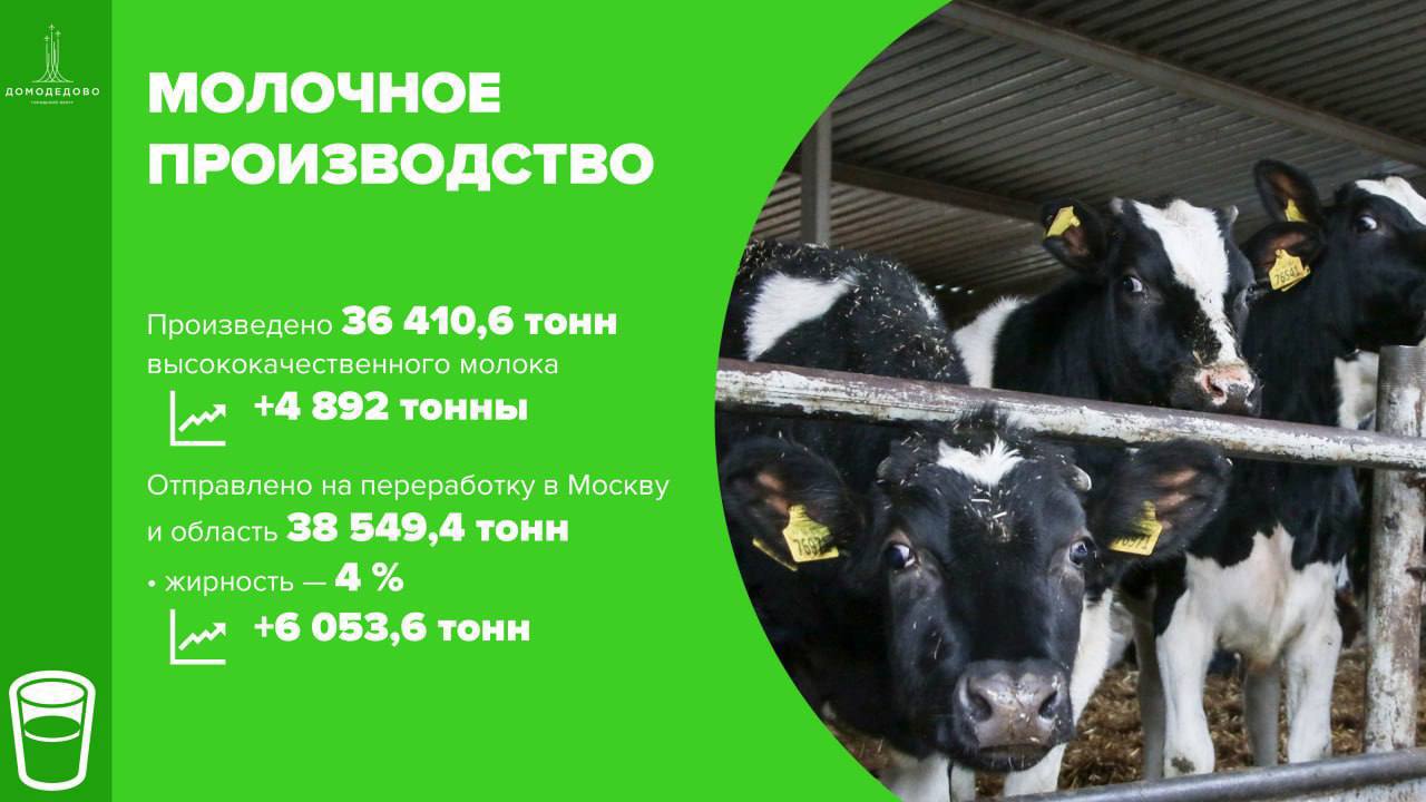 «В животноводстве тоже хорошие результаты после обновления поголовья скота на племзаводах: произведено более 36 тысяч тонн молока – увеличение на почти 5 тысяч тонн. Это показатель стабильной работы и грамотного подхода к развитию отрасли», – глава Домодедово Евгения Хрусталева.