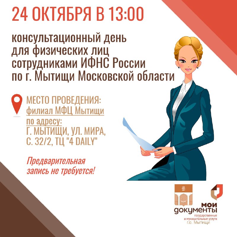 Жители Мытищ могут получить бесплатные консультации по налогам 24 октября с 13.00 до 15.00 в филиале МФЦ, расположенном в ТЦ 4Daily.