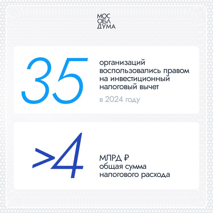 «Согласно информации о налоговых расходах Московской области за 2024 год, правом на инвестиционный налоговый вычет в целом воспользовались 35 организаций на общую сумму налогового расхода свыше 4 миллиардов рублей. Из них две – получили инвествычет в размере 100 процентов стоимости безвозмездно переданного имущества организациям среднего профессионального образования»,
