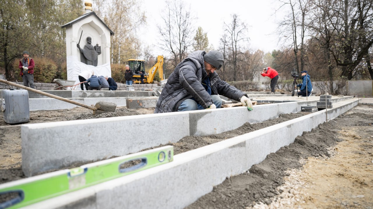 По губернаторской программе подрядчик уже выполнил установку подпорной стенки, обустроил тропиночную сеть за памятным знаком. Сейчас специалисты укладывают новую плитку.