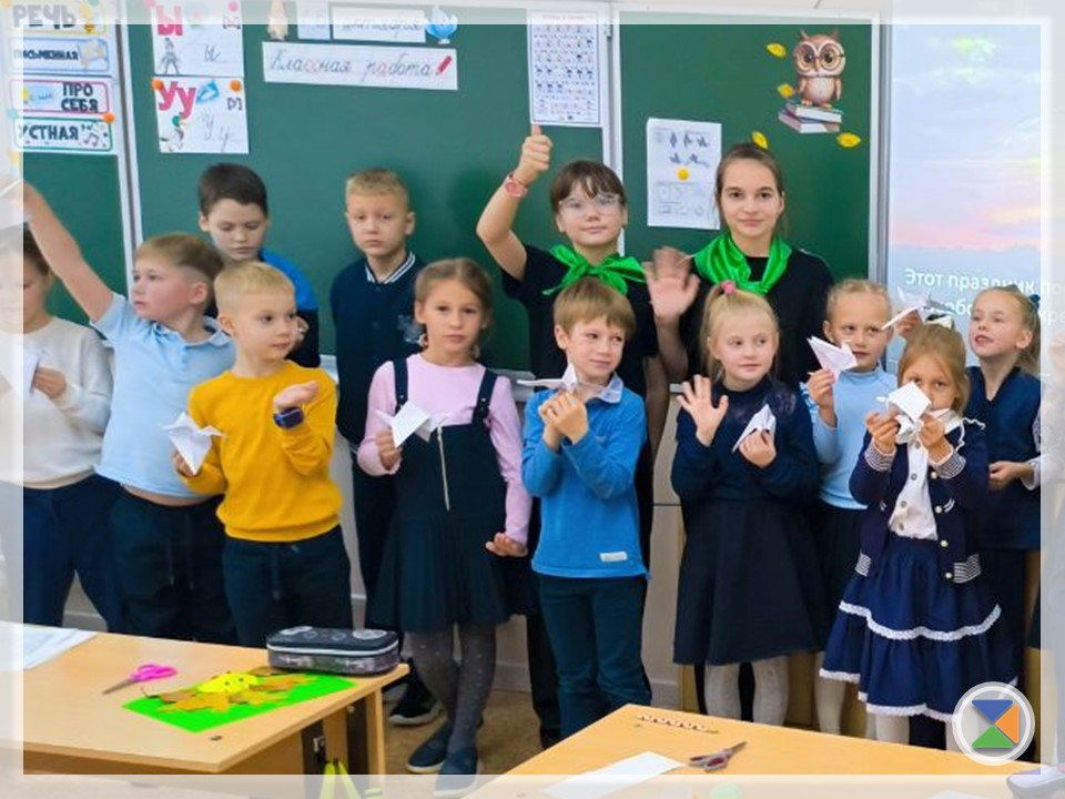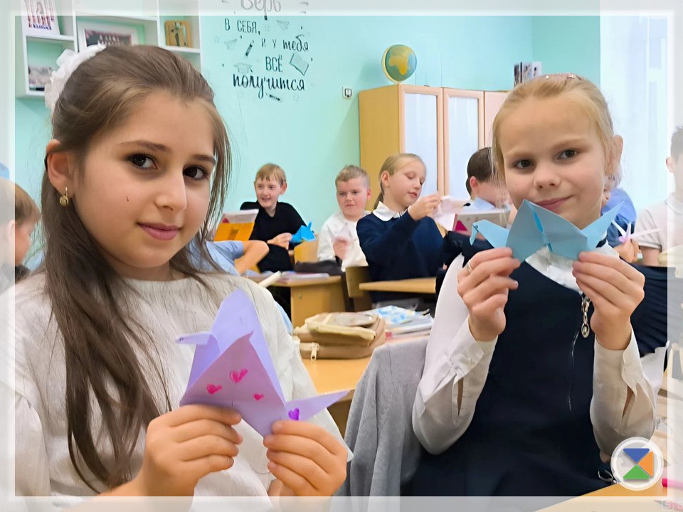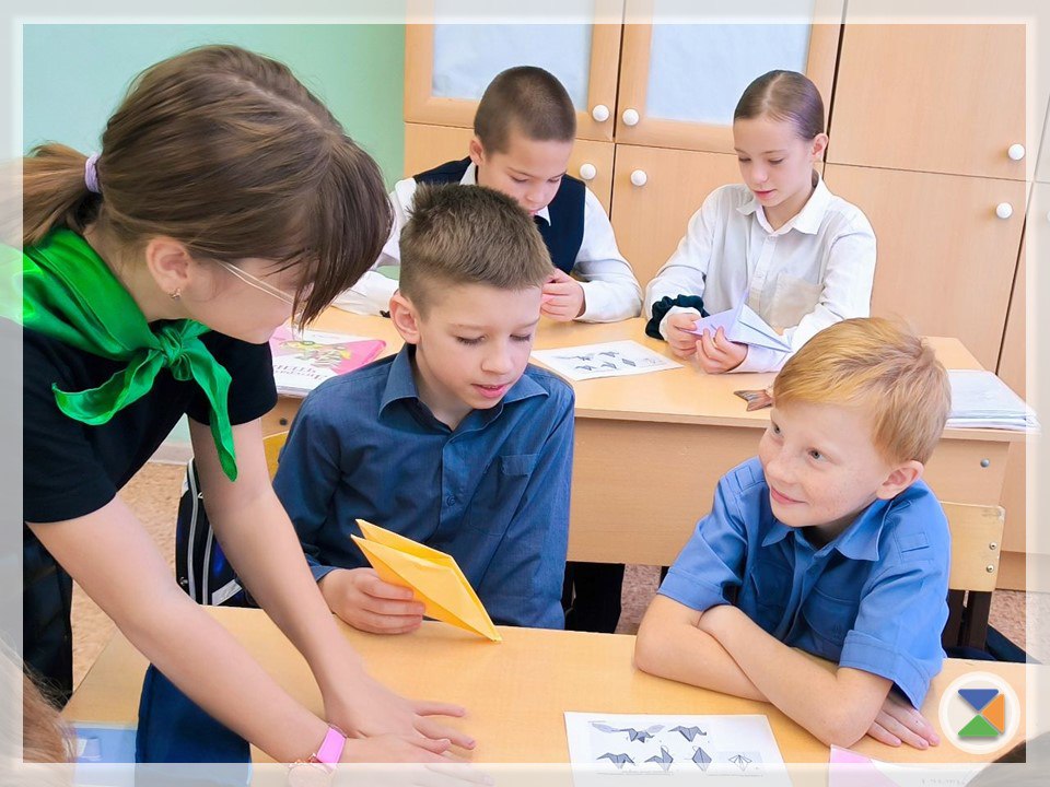 Ученики 5а класса помогли третьеклассникам научиться делать бумажных журавликов. Сначала они посетили 3г класс, а затем отправились к своему первому учителю в 1а.
