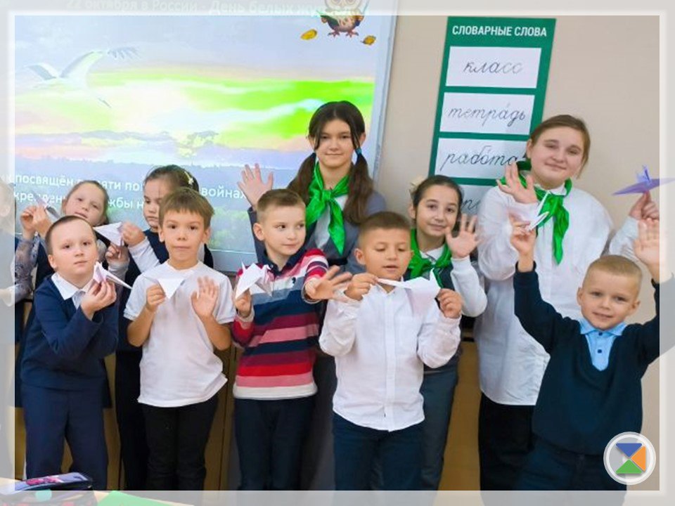 Пятиклассники показали презентацию о разнообразии журавлей в природе, научили младших школьников превращать прямоугольный лист в квадрат, собирать базовую форму "птица" и украшать своих птиц.