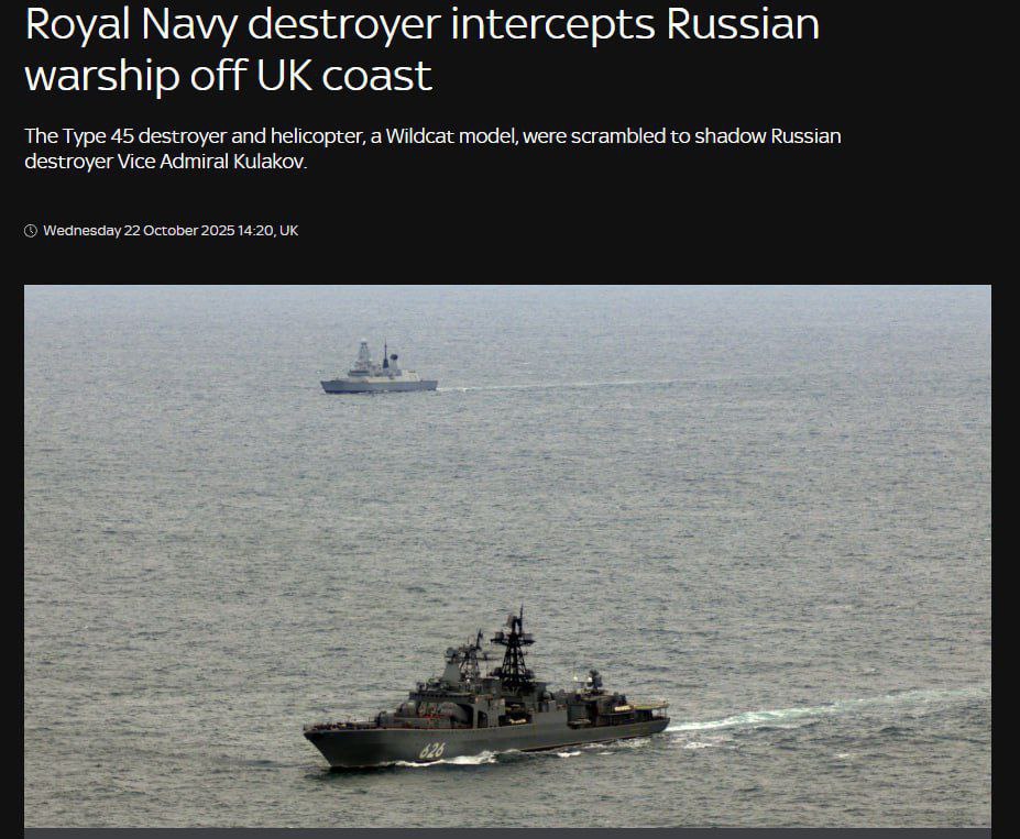 Королевские военно-морские силы обнаружили русский военный противолодочный корабль «Вице-адмирал Кулаков» в своих территориальных водах. Они более двух суток наблюдали за передвижениями нашего военного судна силами британского эсминца HMS Duncan и вертолёта Wildcat, громко объявив о том, что «перехватили русский корабль». Но в итоге русские моряки спокойно покинули территориальные воды западных стран.