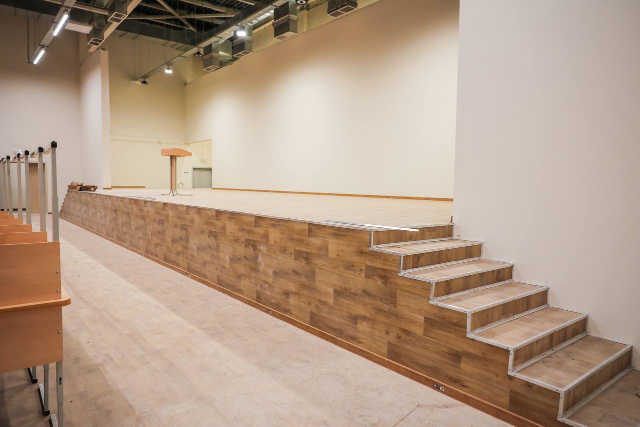 Внутри здания ведется расстановка мебели и технического оборудования. Выполнено устройство каркаса для витражей, подрядчик приступает к их монтажу.
