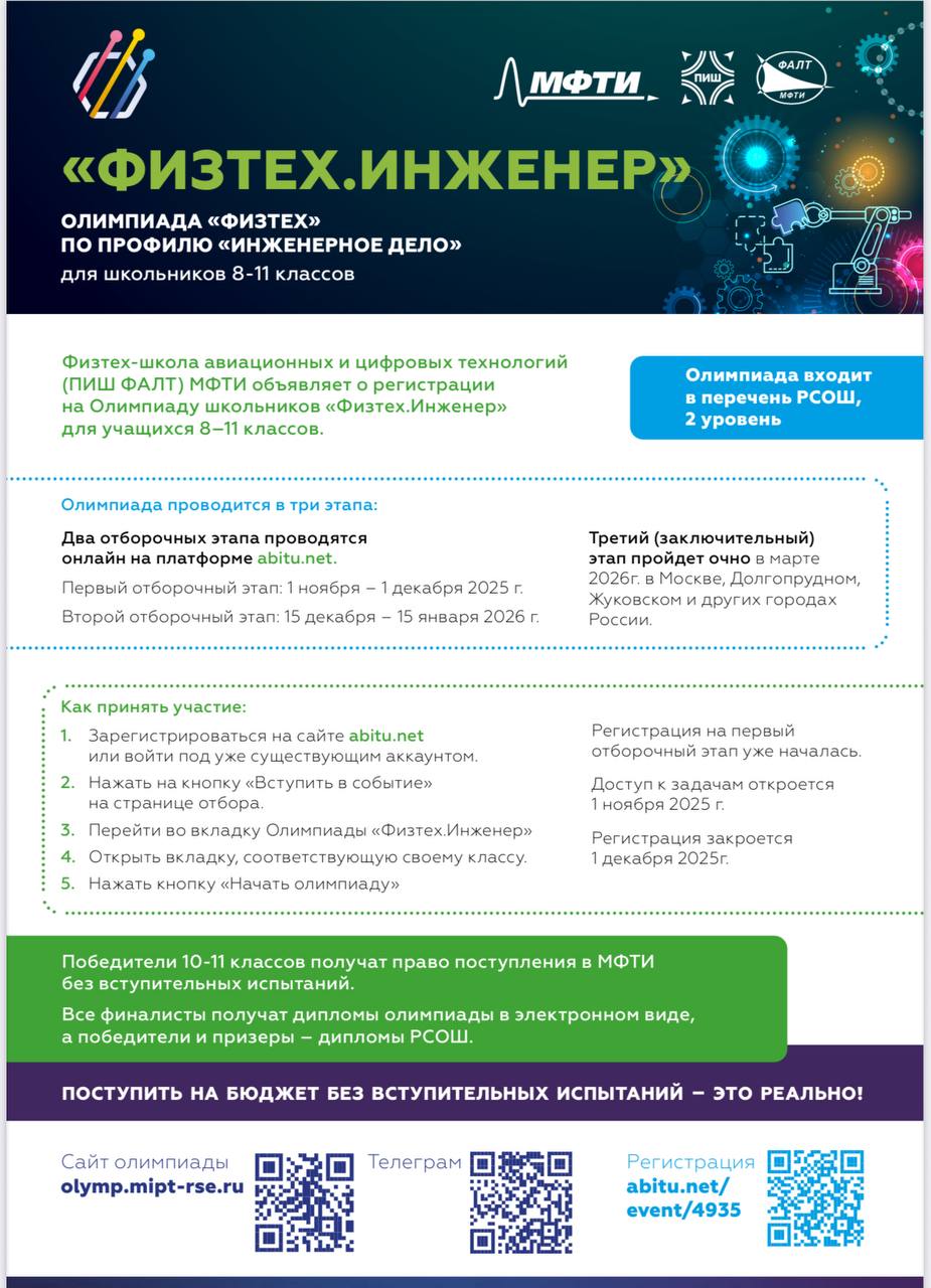1 ноября 2025 года стартует первый отборочный этап олимпиады школьников «Физтех» по профилю «Инженерное дело» («Физтех.Инженер»).
