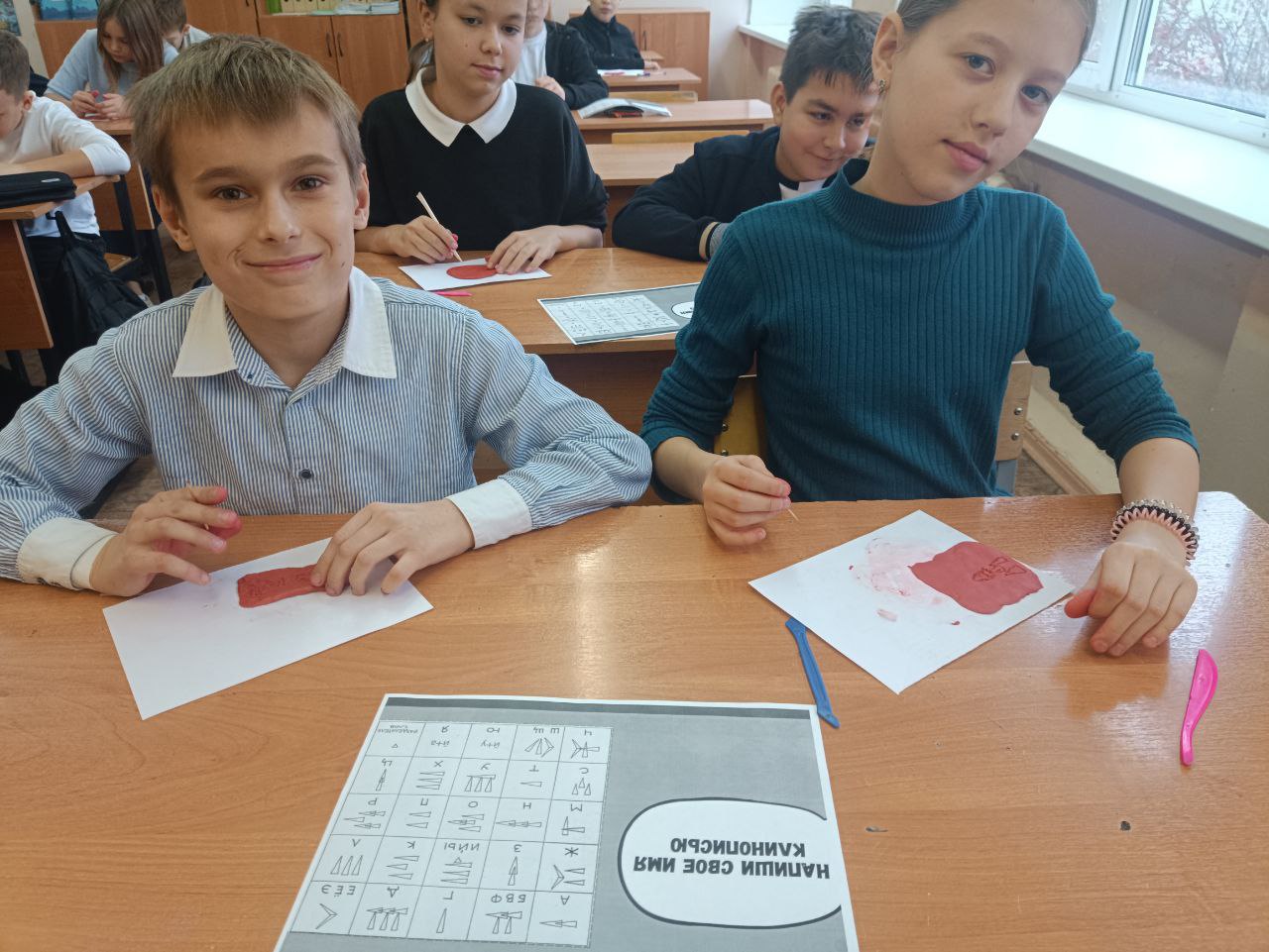 Сегодня ученики 5м класса на уроке истории (учитель Чистякова Надежда Алексеевна) освоили древнюю шумерскую письменность! С помощью деревянных палочек на глиняных пластинках нанесли знаки, обозначающие их имена.
