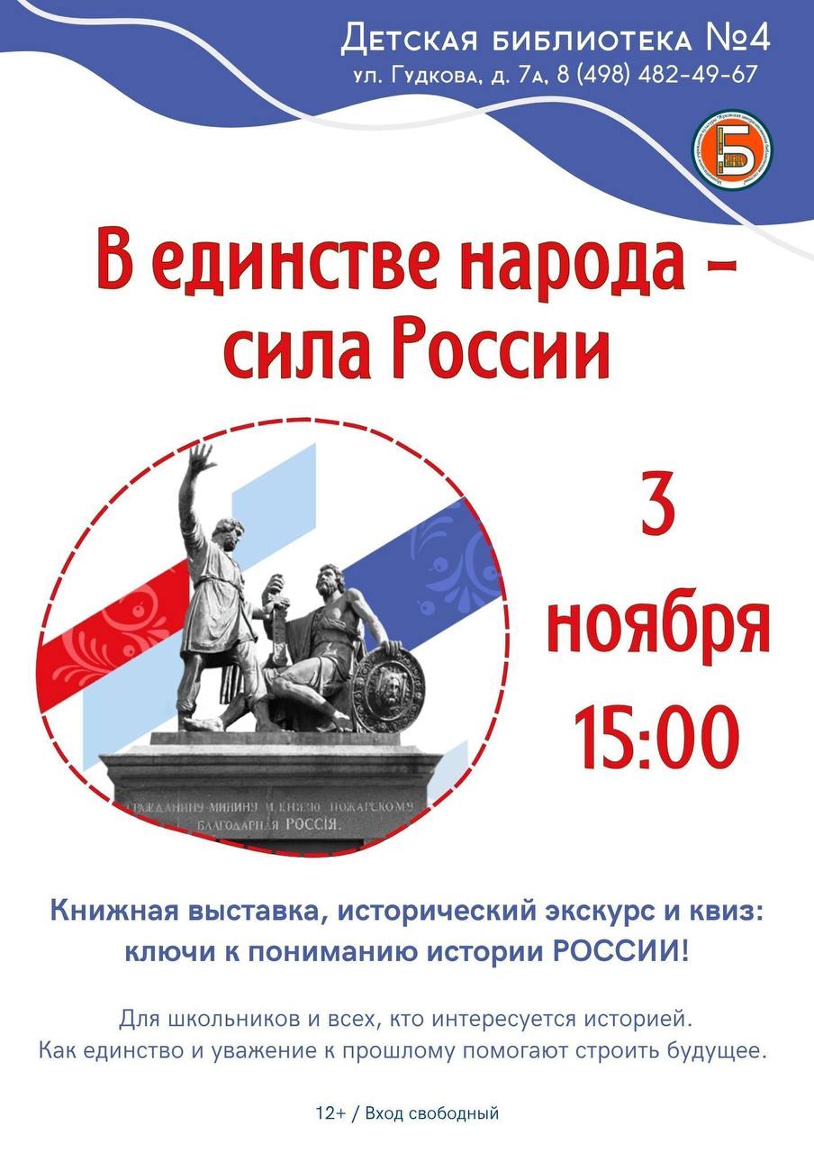 Библиотека №4 приглашает всех желающих на праздник, посвященный Дню народного единства «В единстве народа — сила России».