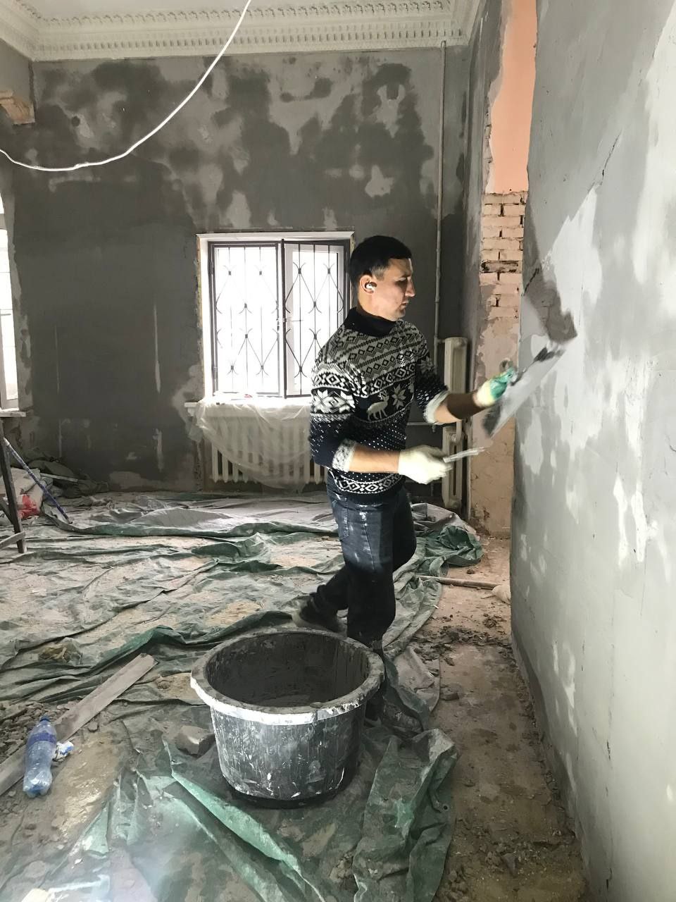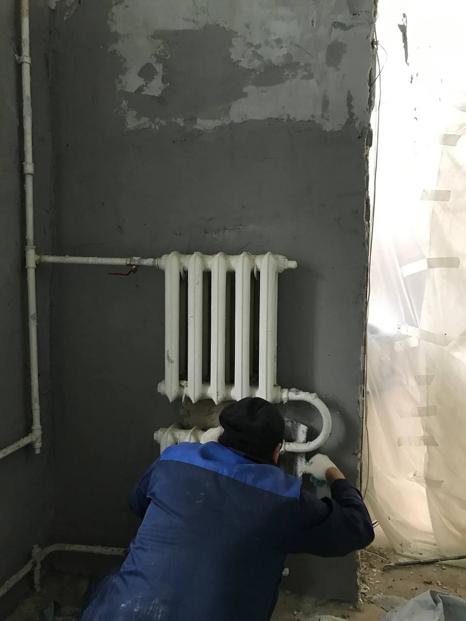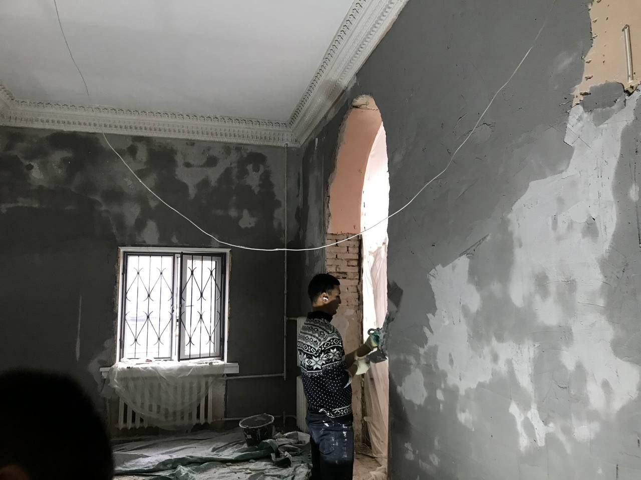В настоящее время рабочие подрядной организации выравнивают стены, предварительно сняв плитку. Также они демонтировали короб от подъёмника, который располагался в этом же зале и вёл в подвал.