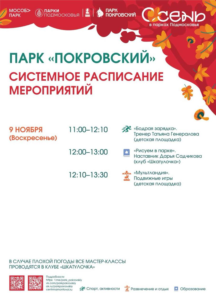 В парке «Покровский» г. Хотьково пройдут мастер-классы «Рисуем в парке», открытие тренировки по скандинавской ходьбе, «Бодрая зарядка», творческая мастерская «Парк учит творить», подвижные игры «Мультания», мастер-класс «Покровская столярка» и мастер-класс по росписи солдатиков.