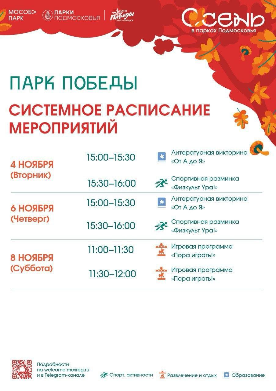 В парке Победы г. Краснозаводск пройдут литературная викторина "От А до Я", спортивная разминка "Физкульт Ура!" и игровая программа "Пора играть!".