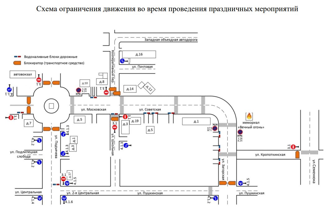 8 ноября с 06:00 до 12:00 в связи с проведением праздничных мероприятий, посвящённых памяти Святого покровителя города Дмитрова Димитрия Солунского, будет полностью прекращено движение автотранспорта на следующих участках дорог: ул. Загорская — ул. Советская — ул. Школьная — пер. Кооперативный — ул. Московская — ул. Подъячева.