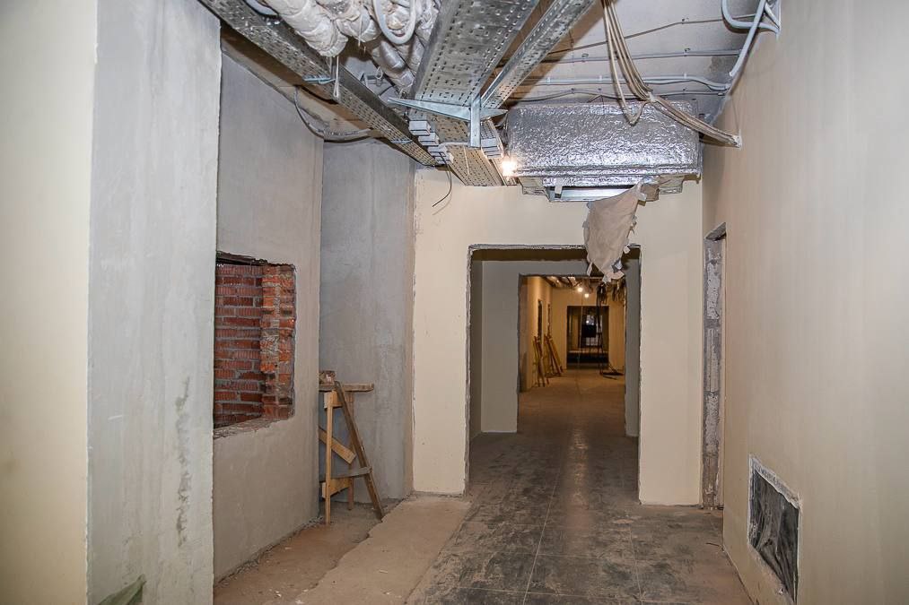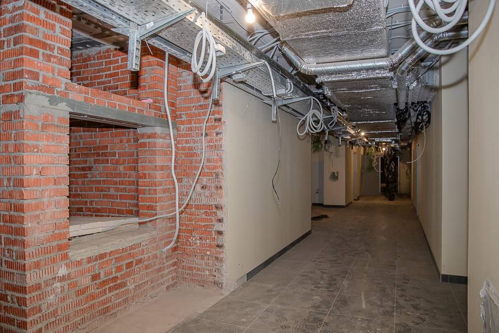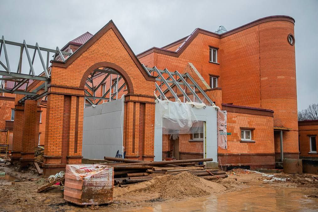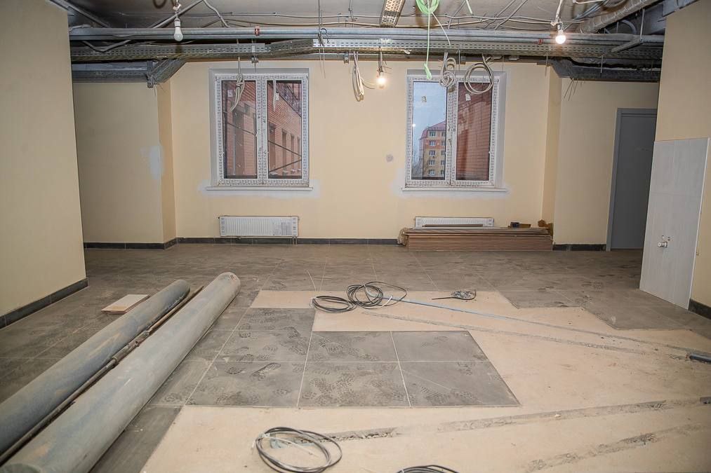 Готовность объекта сейчас составляет 80% — в здании ведутся плиточные работы, окраска стен и монтаж слаботочных систем. Всего на площадке задействовано 38 человек и 2 единицы техники.