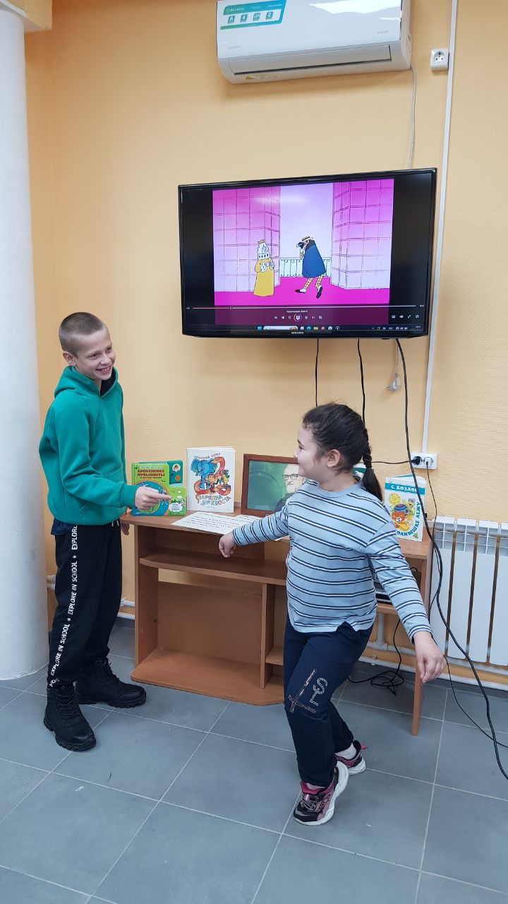 В дни школьных каникул дети участвовали в познавательной игре «Любимые мультяшки со страниц книг», посвящённой юбилею композитора Геннадия Гладкова.