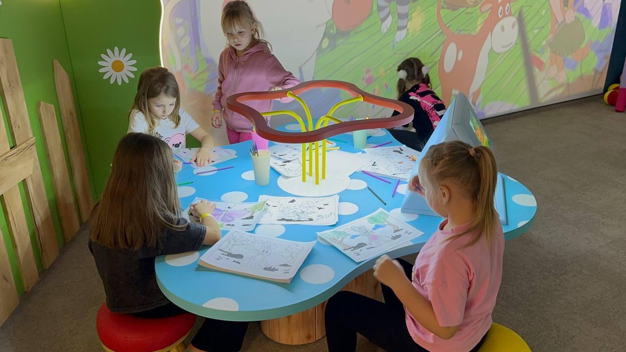 Большая часть новой зоны – интерактивная игровая площадка: сухой бассейн, карусель, горки, домик «Почта», мини-кинотеатр с показами мультфильмов.