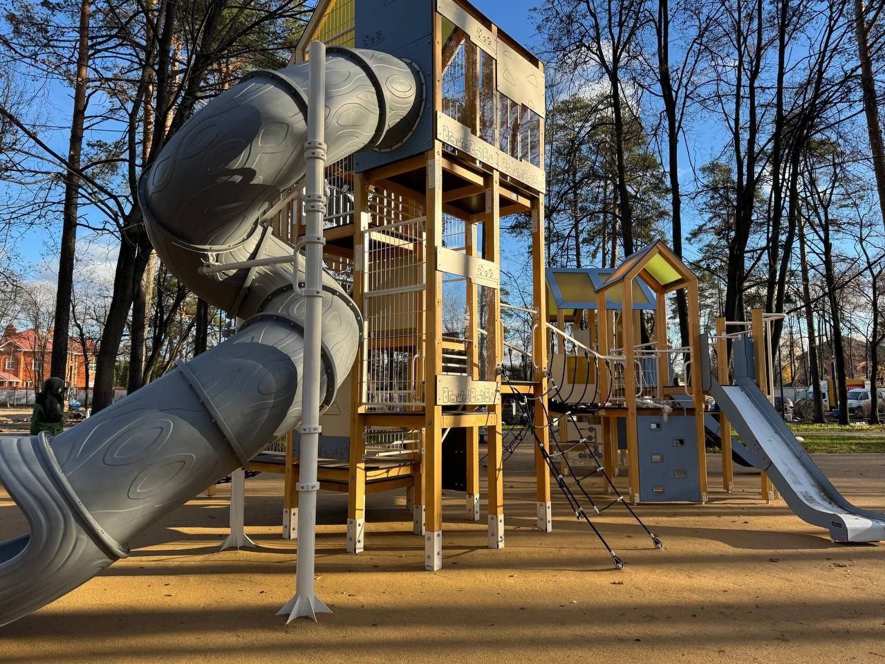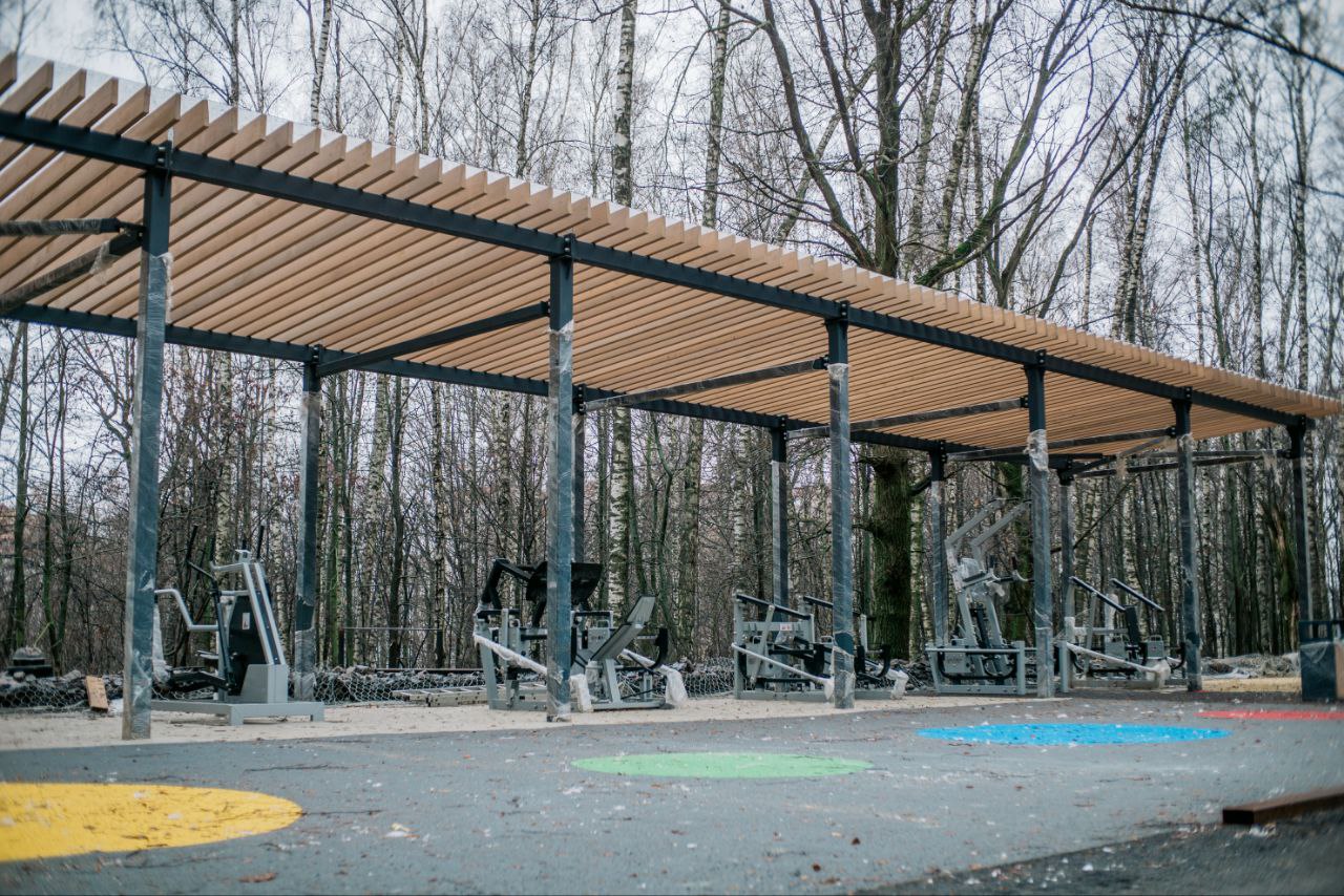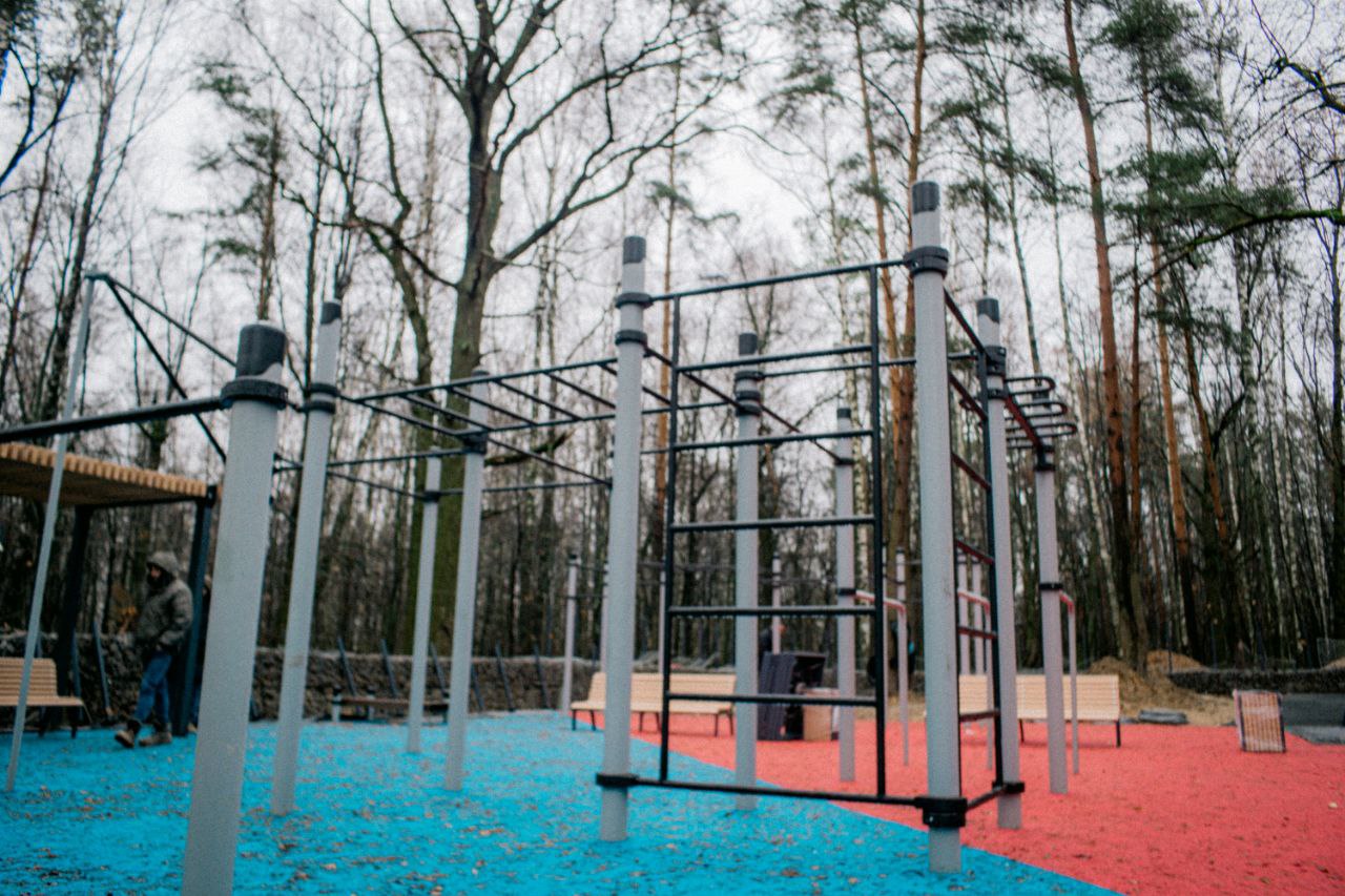 В лесопарке в Дзержинском все работы также в стадии завершения. Подрядчик проложил дорожки, установил опоры освещения, мафы, тренажеры и др.
