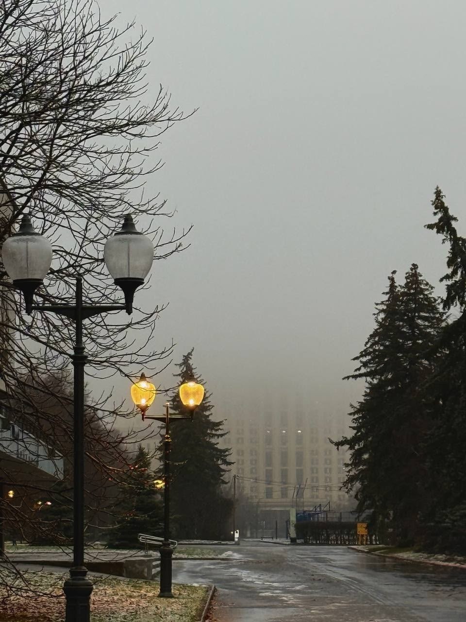 Густой туман накрыл Подмосковье после ледяного дождя. Видимость практически нулевая.