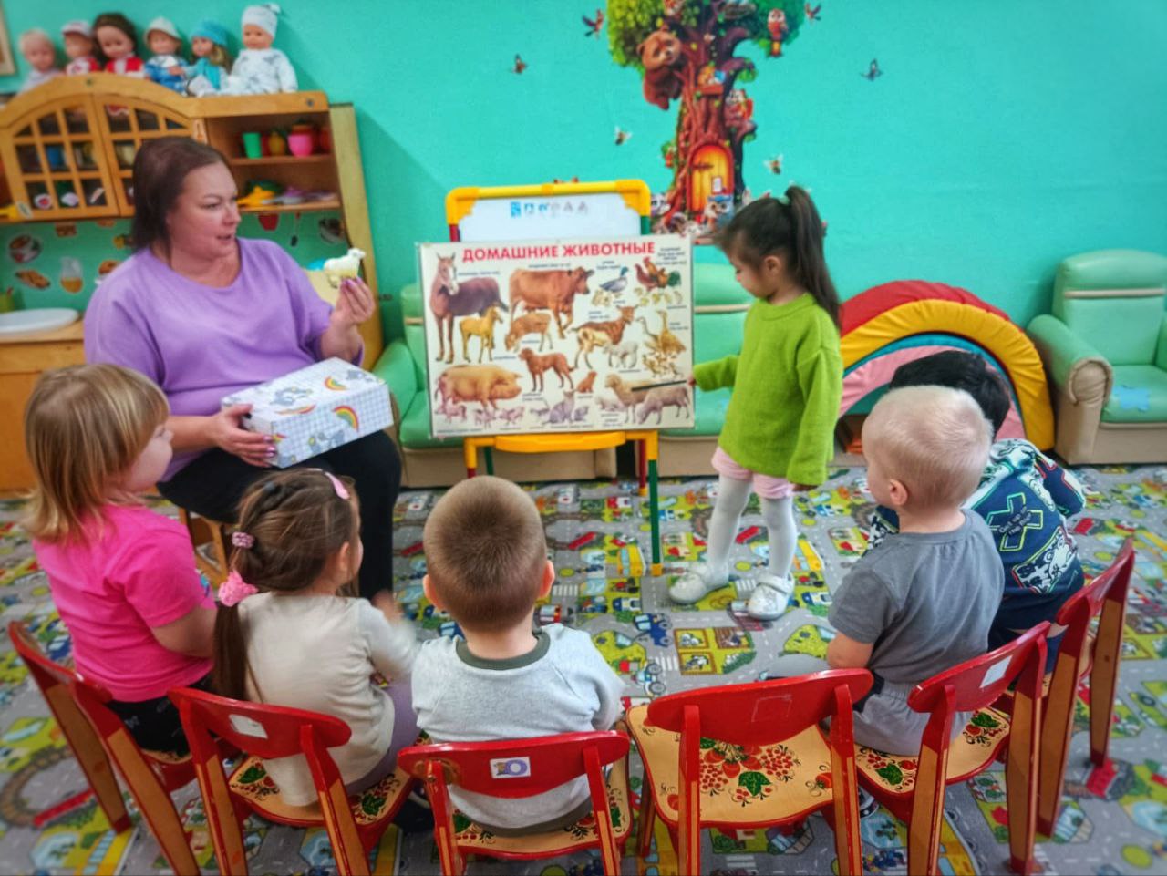 В рамках реализации проекта "Предшкола: стандарт детского сада" в дошкольном отделении гимназии №2 м.о. Чехов (здание 3, п. Васькино) в первой младшей группе №41 на тематической неделе "Спортивная карусель" (лексическая тема "Домашние животные") прошло познавательное занятие, на котором дошколята познакомились с домашними животными, с интересом рассмотрели картинки и игрушечные фигурки животных, поиграли в дидактические игры "Угадай, чей малыш!" и "Кто как кричит".