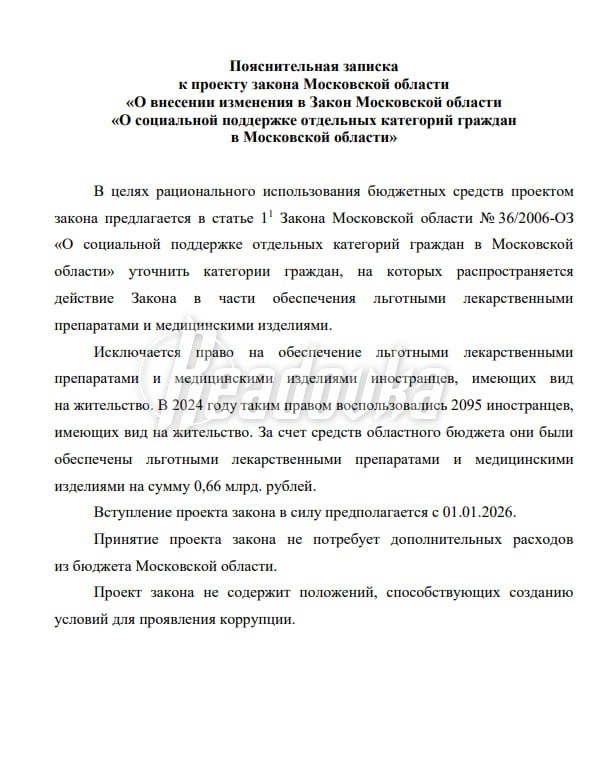 В 2024 году этим правом воспользовались 2 тыс иностранцев с видом на жительство. За счет областного бюджета они получили льготные лекарства и медицинские изделия на сумму 660 млн, указано в пояснительной записке.