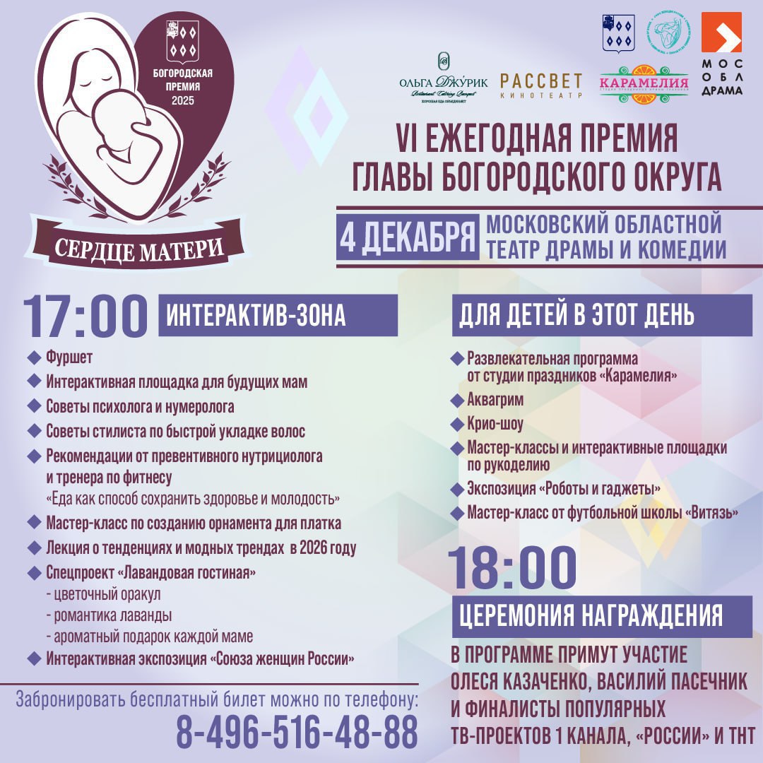 4 декабря в Богородском городском округе пройдёт шестая ежегодная церемония вручения премии «Сердце матери». Гостей мероприятия ждёт насыщенная праздничная программа.