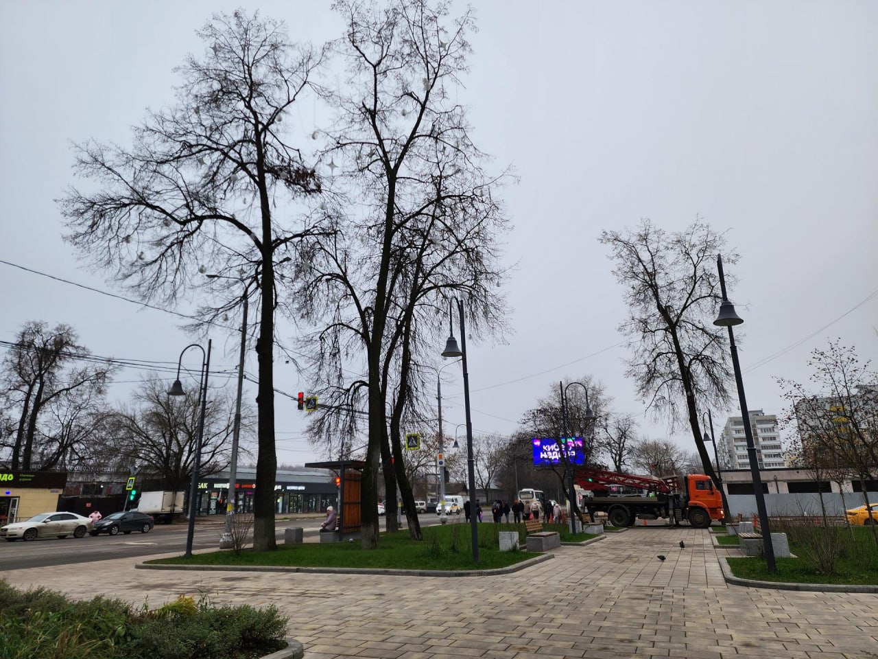 На Фонтанной площади работы только начали. Здесь работает три бригады. Они уже успели установить украшения на фонарях и поставить кукольные статуи в виде девочек, держащих снежки. Сейчас монтируют навес из гирлянды и украшают деревья шарами и звёздами. Также начали привозить всё необходимое для установки главной ёлки города.