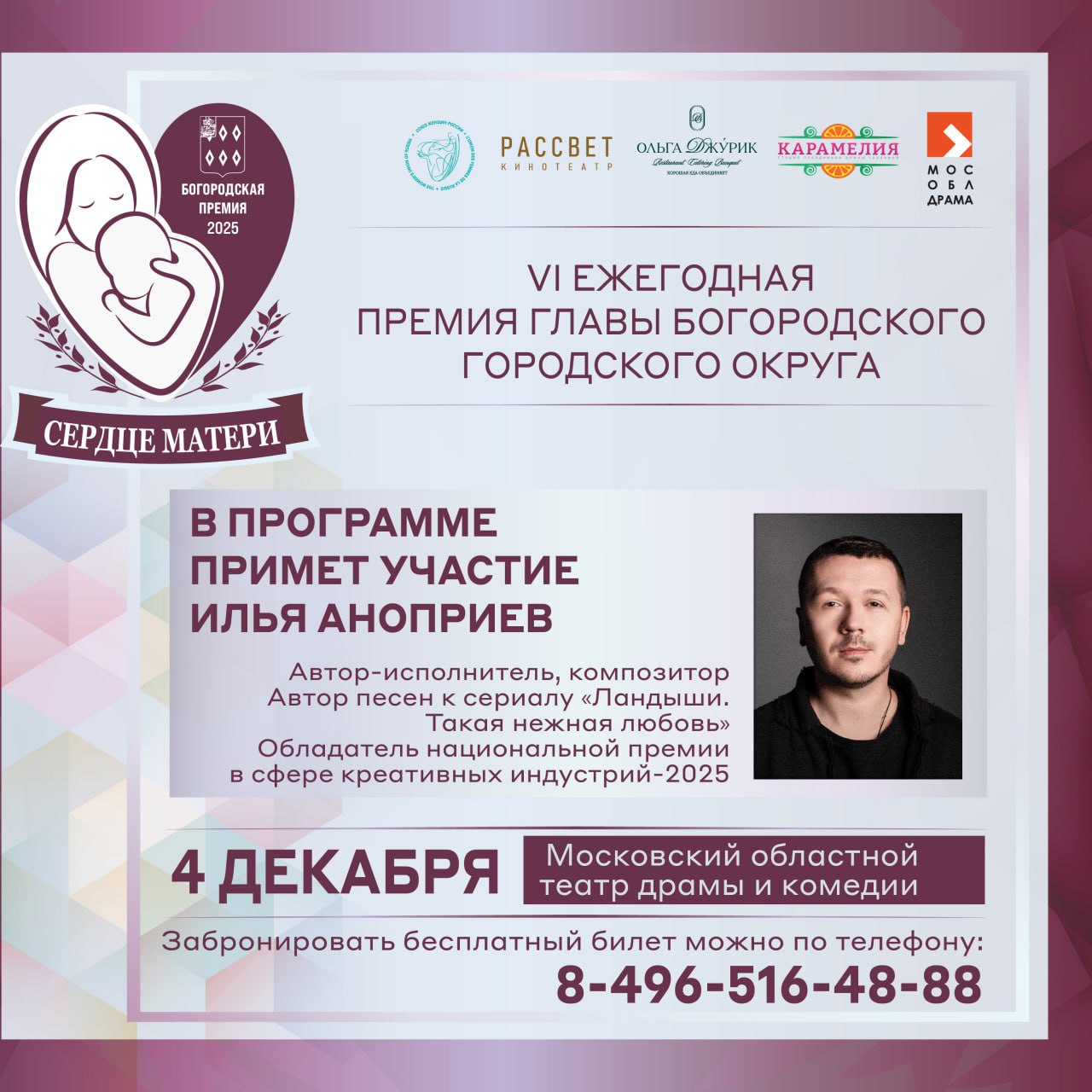 Уже завтра, 4 декабря, в Ногинске в Московском областном театре пройдёт шестая церемония вручения премии «Сердце матери».