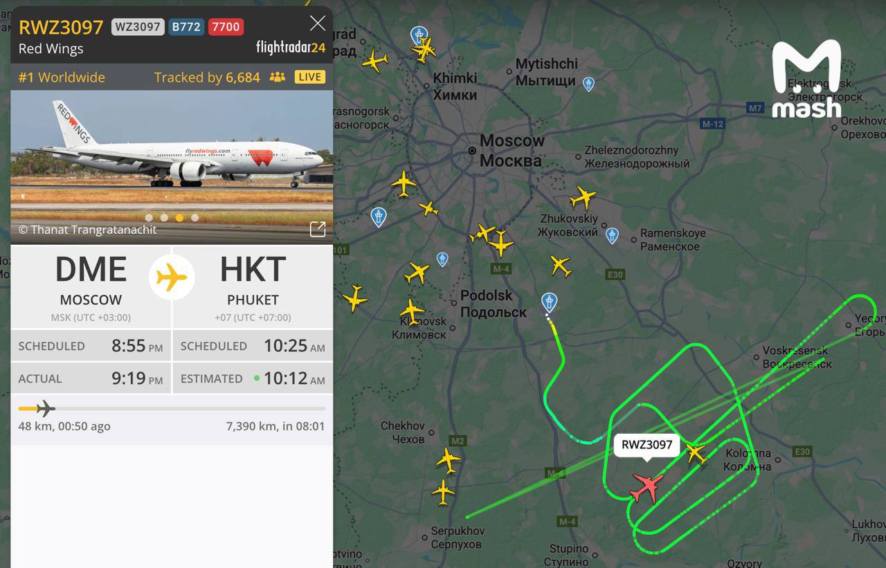 Самолёт Red Wings, летевший из Москвы в Пхукет, подал сигнал бедствия и нарезает круги над Подмосковьем.